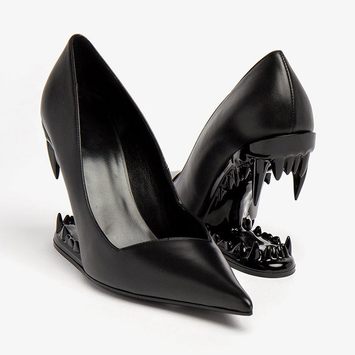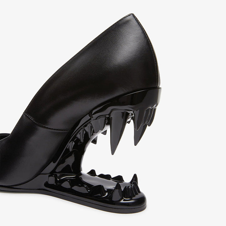 Sleek and architectural, these black leather pumps feature a tone-on-tone sculpted heel and an asymmetrical vamp. A pointed toe and smooth leather insole complete the sharp, modern profile.Upper: 100% calf leather