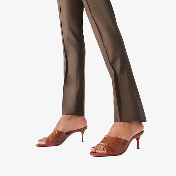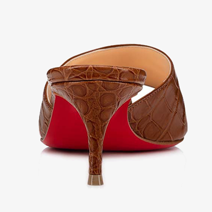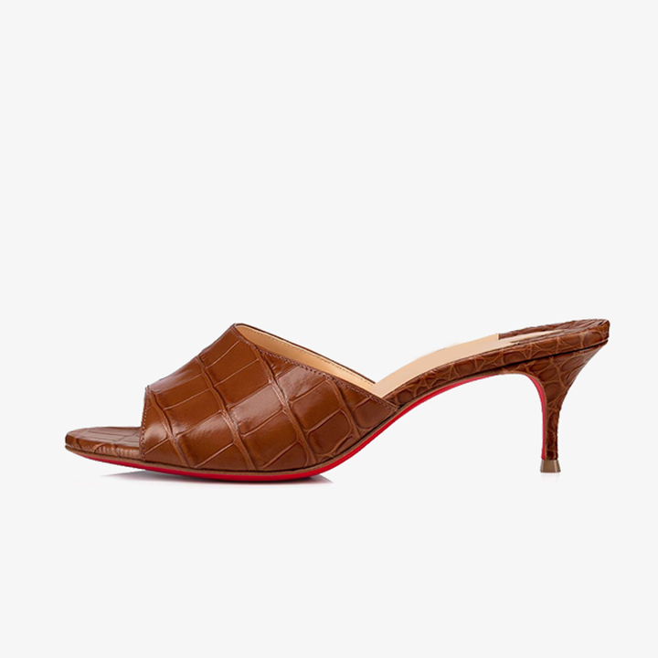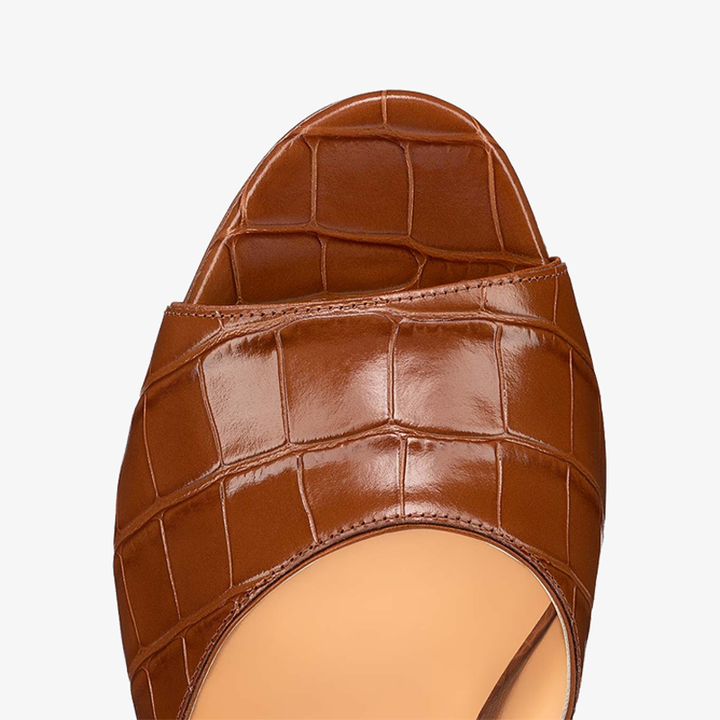 This minimalist pump exudes timeless elegance, set on a slender 60 mm heel. The wide open-toed upper beautifully accentuates the foot, while delicate stitching highlights the craftsmanship. Designed entirely in alligator-embossed calfskin, its tapered shape adds a touch of sophistication.