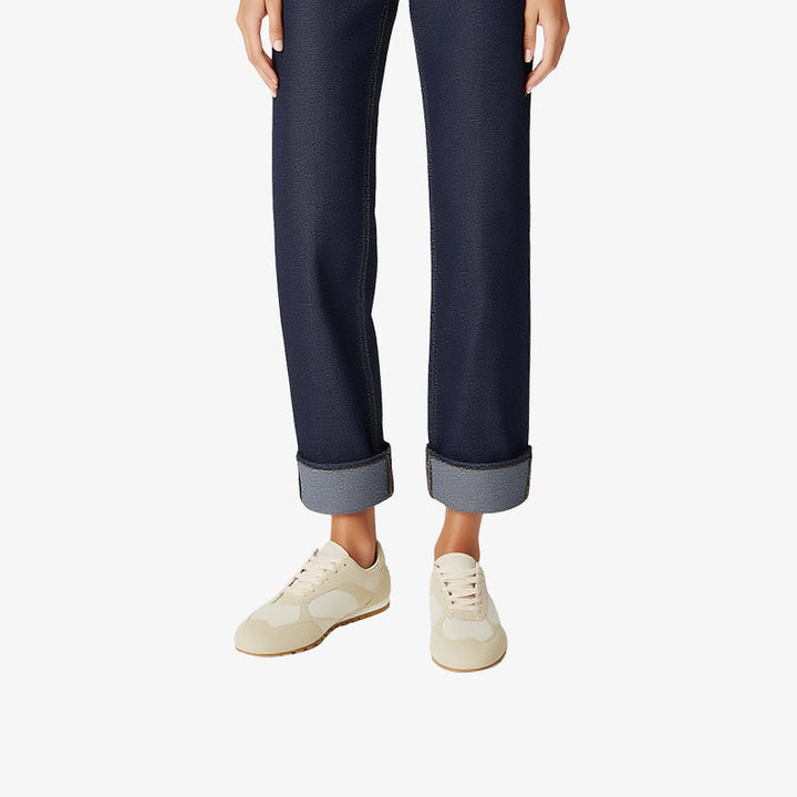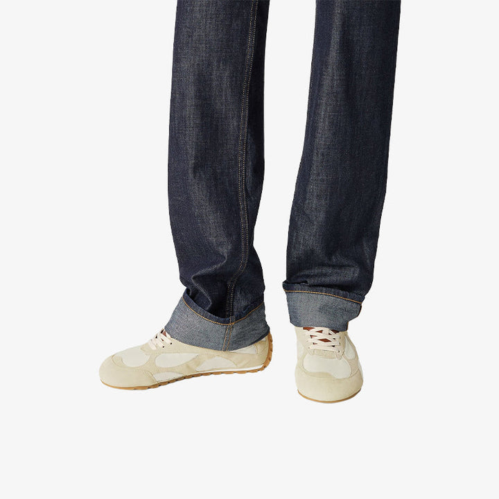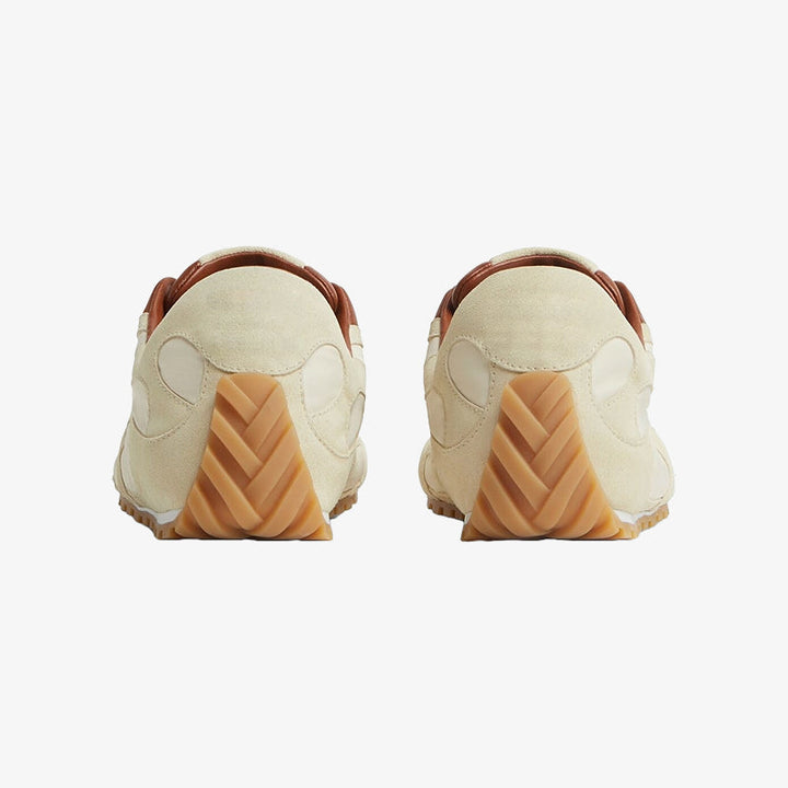 A sleek low-top lace-up sneaker blends soft suede with featherlight nylon, accented by leather trims for understated elegance. Lined with supple calf leather for all-day comfort, it showcases a Sea Salt/Caramel color palette that pairs versatility with warmth, finished with a durable rubber outsole for effortless stride.