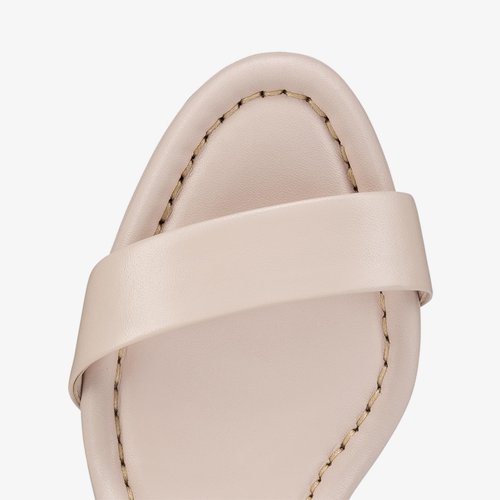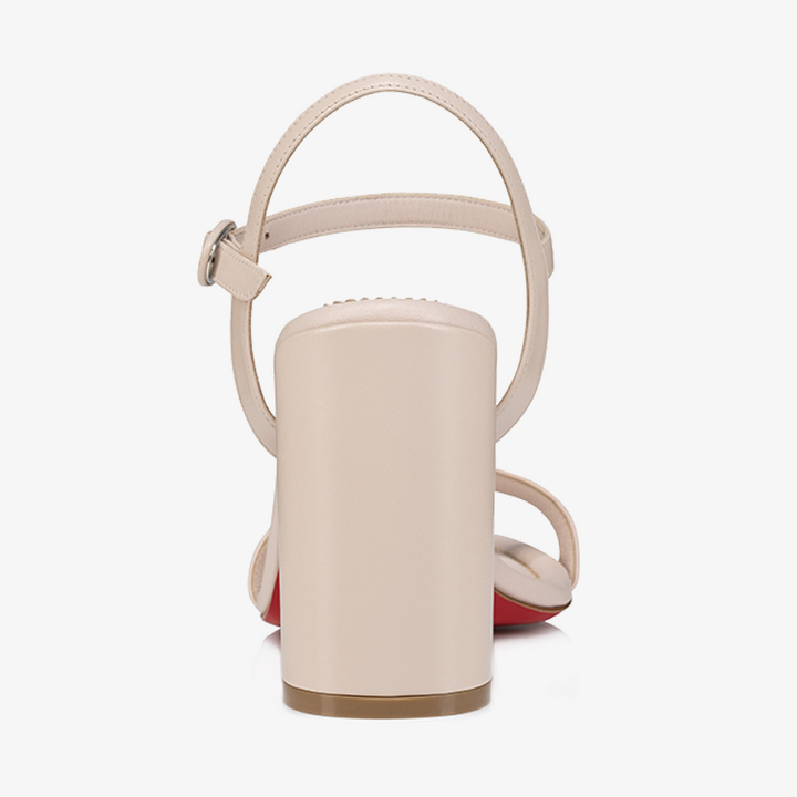 The sandal makes an entrance with a gently tapered 100 mm block heel and rounded open toe. Crafted from calf leather, the modern beige design makes this sandal perfect for both day and evening wear. Featuring a single ankle strap with an oval buckle, the red sole contrasts beautifully with the beige upper and lining.