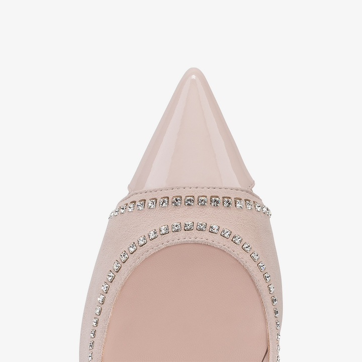 This elegant beige stiletto features a suede leather upper with a patent calf leather toe and heel. The pointed toe and 100 mm slim heel create a sleek silhouette, while sparkling strass details along the edges add a touch of glamour. A sophisticated design perfect for any occasion.