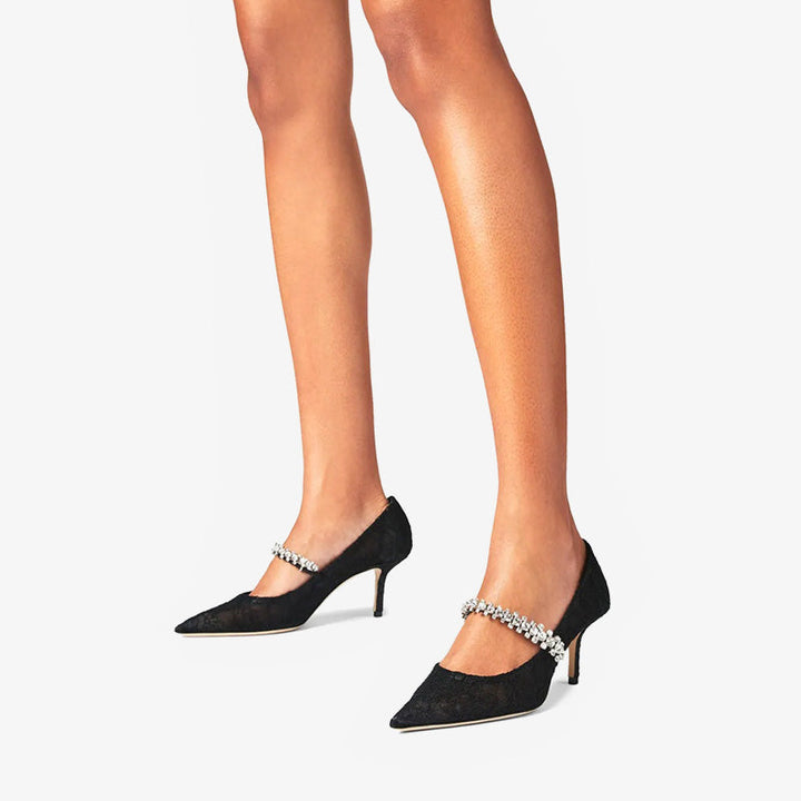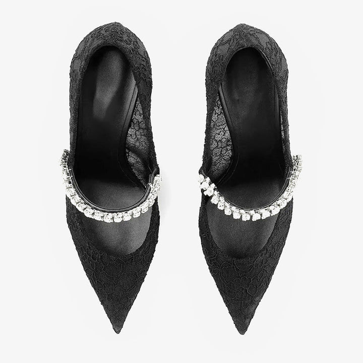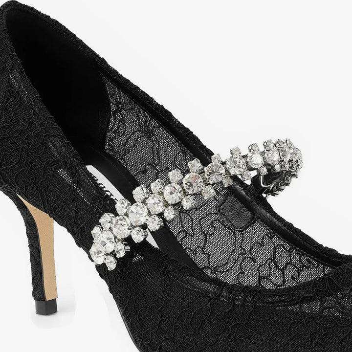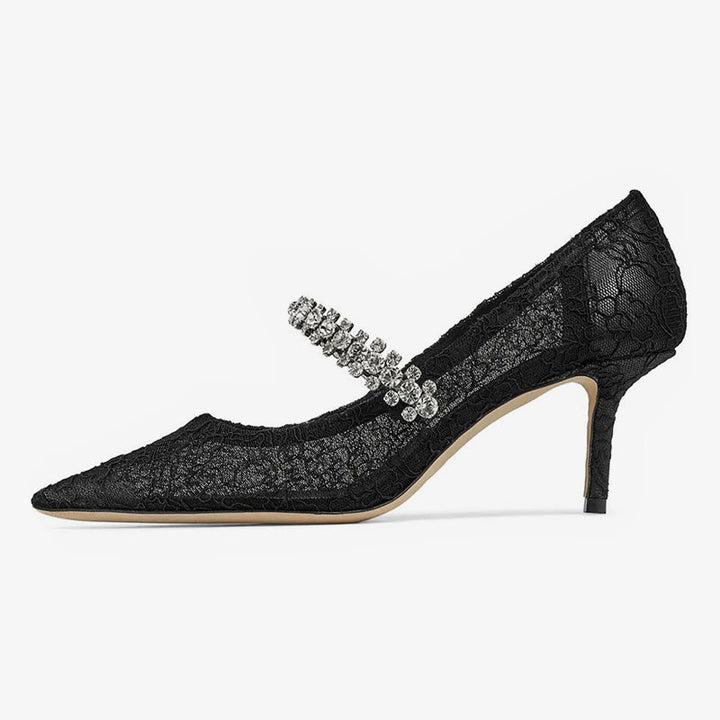 These elegant mid-heel shoes feature delicate lace details, a crystal-embellished design, and a pointed toe. With a tapered heel and leather sole, they offer both style and comfort. The upper is crafted from 95% fabric and 5% lambskin, with a nylon lining for added softness.
