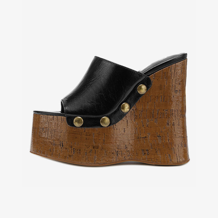 Elevate your summer style with these sleek peep toe wedge mules, crafted from premium black calf leather. Featuring a 140 mm cork-wrapped platform heel, full leather lining and decorative nail accents for a refined finish.?