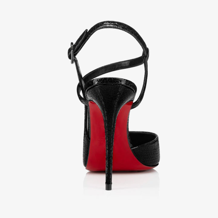 These sleek black leather heels feature a sharply pointed toe and are accented with gunmetal-tone hardware for a modern edge. Secured with a buckle fastening, the design includes a smooth leather lining and sits atop a 100 mm heel that adds height and elegance to any look .