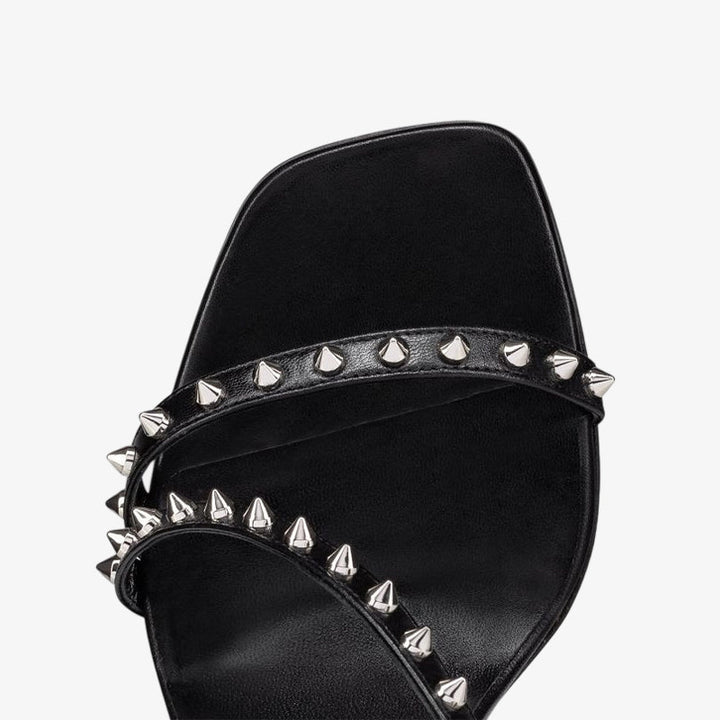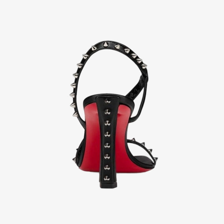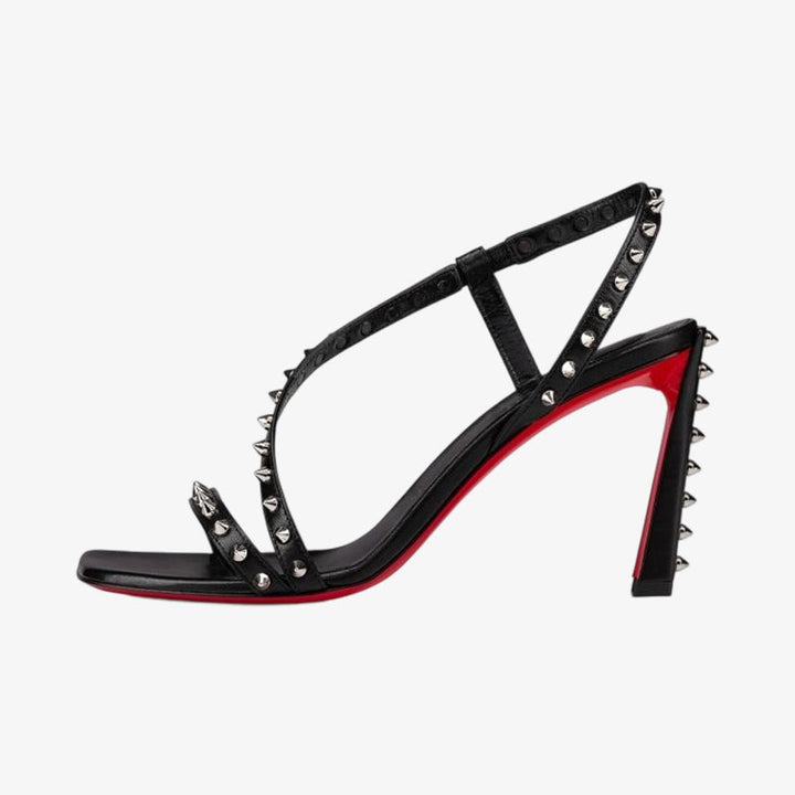 This bold sandal features a square toe and an elegant low-cut vamp, crafted in smooth black calf leather and set on a sleek heel for a refined finish.