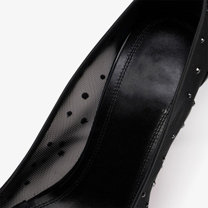 This elegant pump features the iconic Split-toe shape, crafted from sheer black mesh paired with contrasting patent calf leather. Adorned with a gradation of rhinestones, it offers a touch of sparkle while sitting on a 100mm stiletto heel. The perfect balance of sophistication and bold design, these pumps are sure to make a statement.
