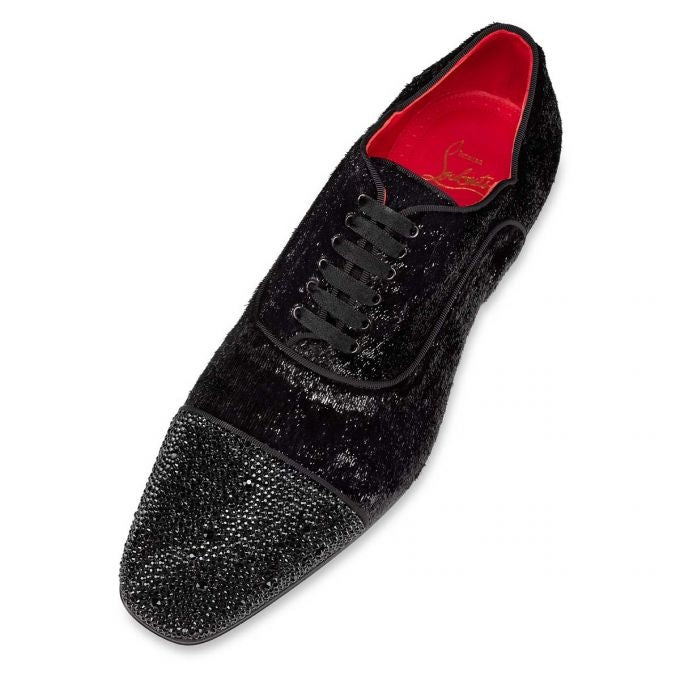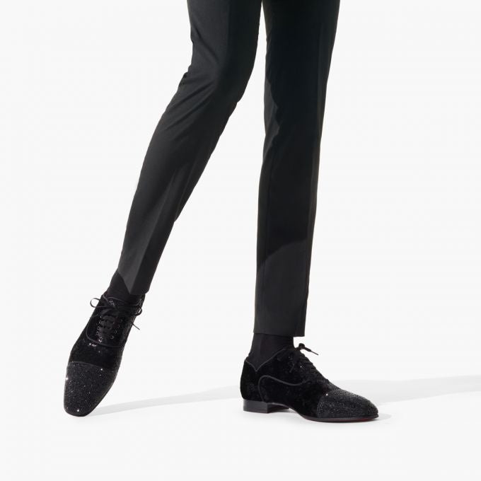 Featuring sleek, enchanting lines, this Oxford shoe showcases creative design with V-shaped notches below the ankle. Crafted from luxurious suede, it combines textures with black lamé veau velours and strass embellishments. Discreet lacing and a tonal grosgrain ribbon trim enhance its refined urban appeal.Upper: 100% suede