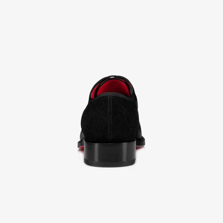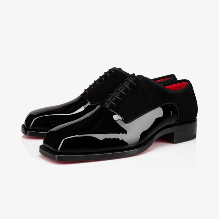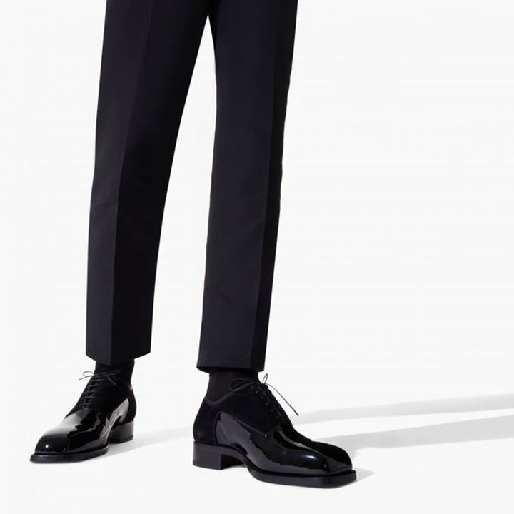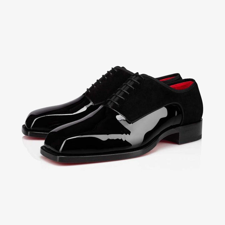 Featuring a distinctive square toe and sartorial lines, this elegant city shoe is designed for optimal comfort with a wider fit. Crafted from black patent leather and veau velour suede, it is framed with grosgrain trim for a refined touch. A notched, sculpted welt and thick sole add bold attitude, making this model a striking addition to any wardrobe.Upper: 100% patent calf leather and suede
