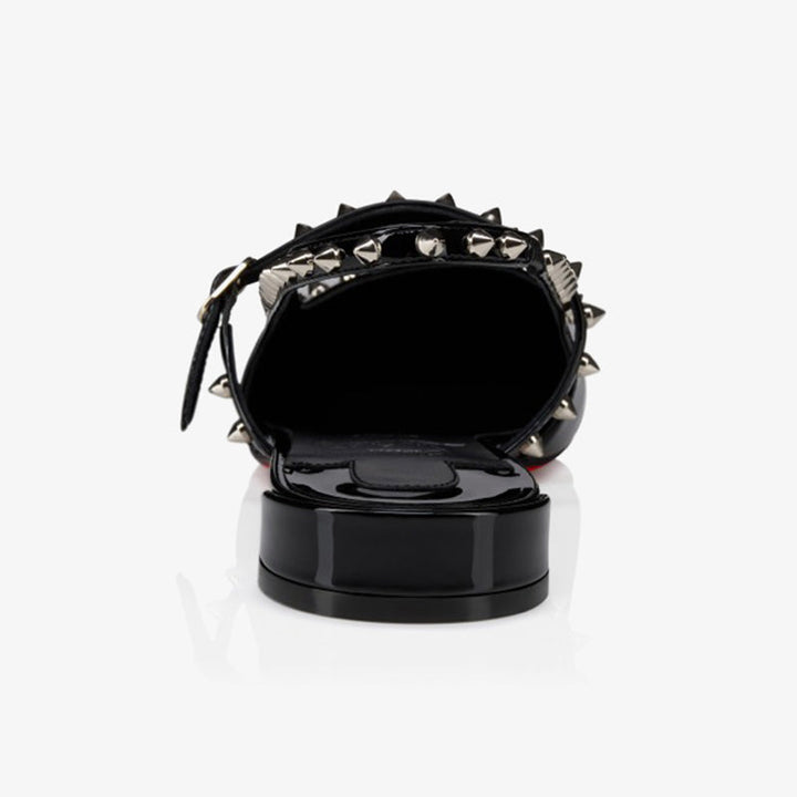 This sophisticated ballerina flat is crafted entirely from black patent material, featuring a slightly rounded toe and a delicate back strap that reveals the foot. Adorned with metallic spikes, a signature detail, it combines elegance with bold edge. The model also features the new "Eternal Red sole," designed with an innovative technique to ensure incomparable durability while preserving the iconic red finish.
