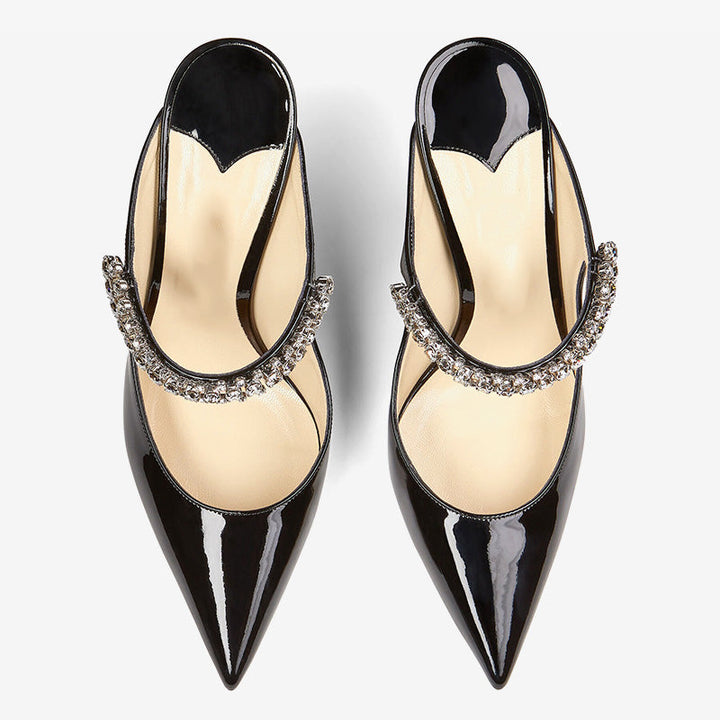 Modern and chic, these black patent leather mules feature a pointed toe and a crystal strap for a touch of elegance. With a sleek slip-on design and a 100mm heel, they elongate the legs and elevate any evening look. Leather lined with a leather sole.