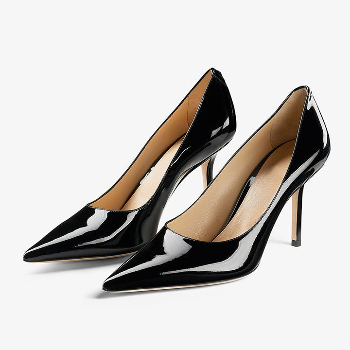 Crafted from glossy patent leather, these sleek pumps are the epitome of refined elegance. Designed with a sharp pointed toe and a slim, sculpted heel, they offer effortless sophistication. The smooth leather lining and sole ensure all-day comfort, making them a timeless essential for any wardrobe.The heel height of this pair is 80mm.