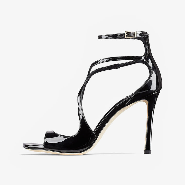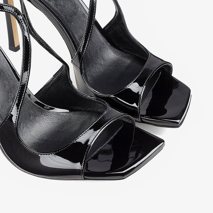 Crafted from glossy patent leather, these black sandals feature delicate curved straps that elegantly wrap the foot. Finished with a square open toe, adjustable ankle strap, and a sleek 110mm slim heel for a modern, refined look.Color:black