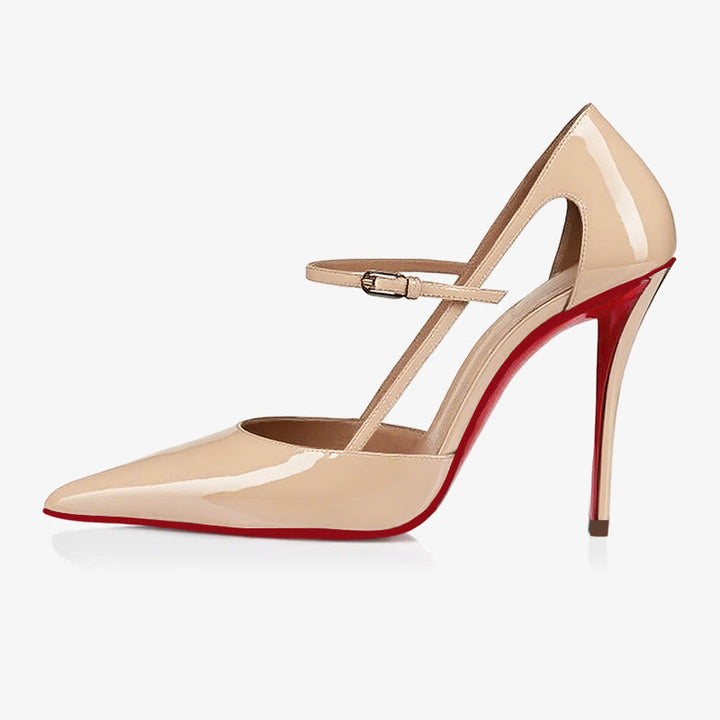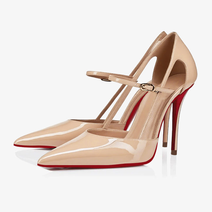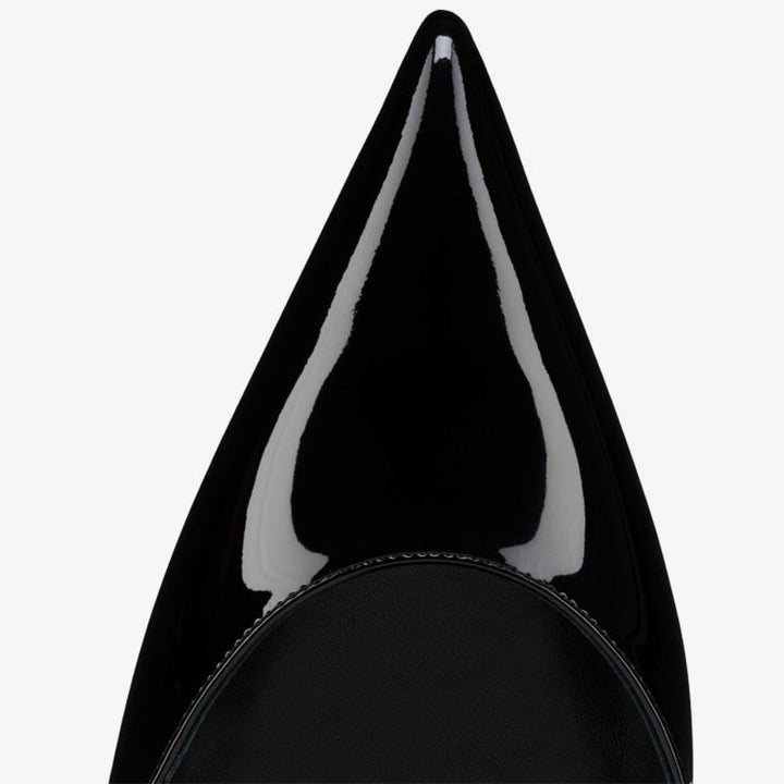 The sleek silhouette of this pump exudes sophistication. Set on a 100 mm stiletto heel, it reveals the iconic red sole and includes a padded insole for added comfort. Crafted in glossy black patent, the design features an open toe and a delicate strap. Thanks to an innovative coating technique, the signature red sole offers exceptional resistance and lasting vibrancy.