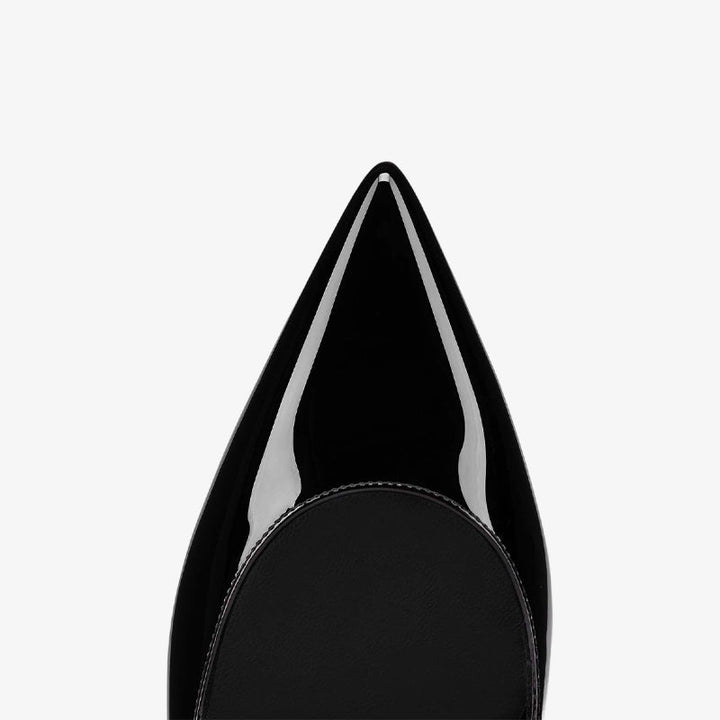 This polished black patent leather flat features a sleek pointed toe, subtle V-shaped ankle cutouts, and a low-top design that elegantly flatters the foot. Clean lines and refined details add a modern urban edge.