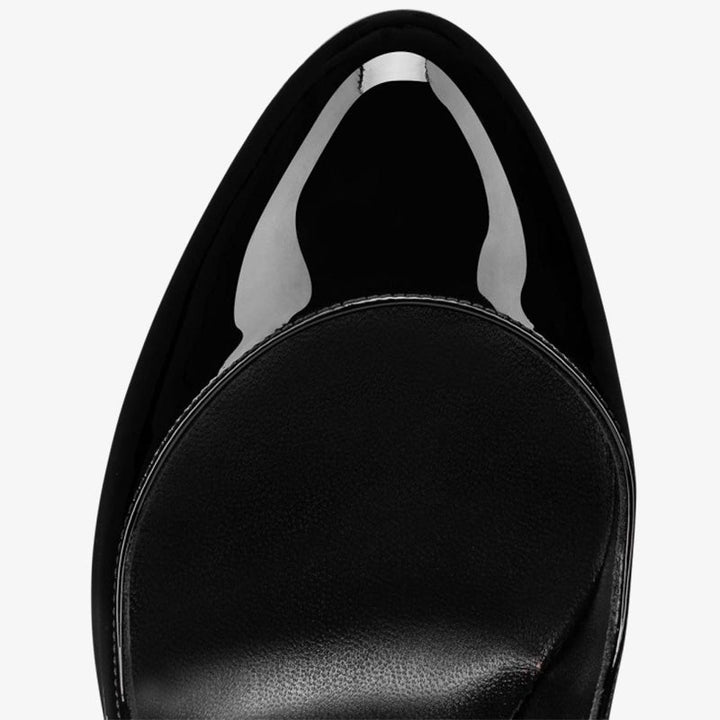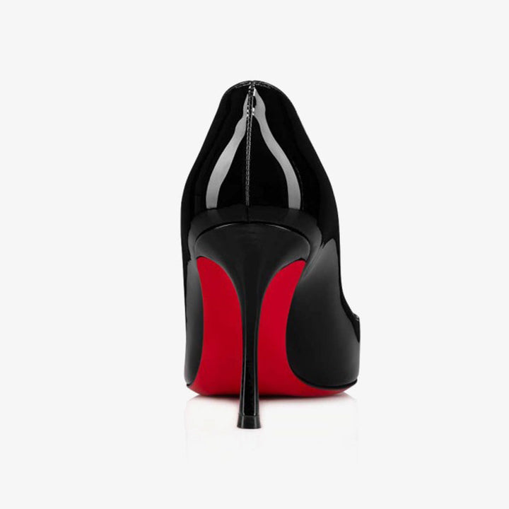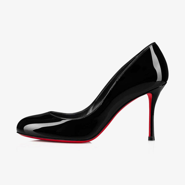 These pumps exude timeless elegance with their sleek silhouette and urban-inspired lines. Crafted entirely in glossy black patent, they feature a rounded toe and a bold neckline that subtly reveals the foot. Set on an 80 mm stiletto heel, this sophisticated style is enhanced by refined details that elevate its minimalist charm.
