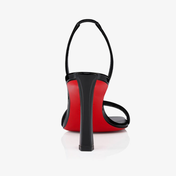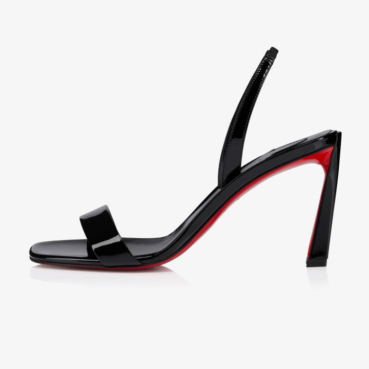 This sophisticated sandal features a square open toe and is set on an 100mm wedge heel for a stylish lift. Crafted entirely from black patent material, it showcases a thin upper and a strap that delicately adorns the top of the foot, offering a chic and modern design for any occasion.