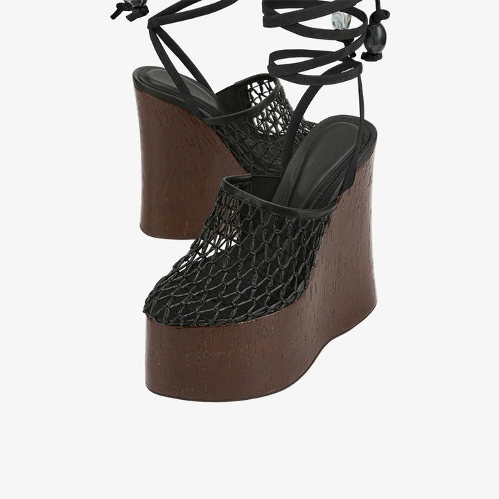 A must-have for summer, these platform clog heels feature a woven fishnet upper, soft calf suede leg ties with bead accents, and a shiny cork-wrapped wedge. Finished with a leather lining, full leather insole, and a sturdy rubber outsole for stylish comfort all day long.