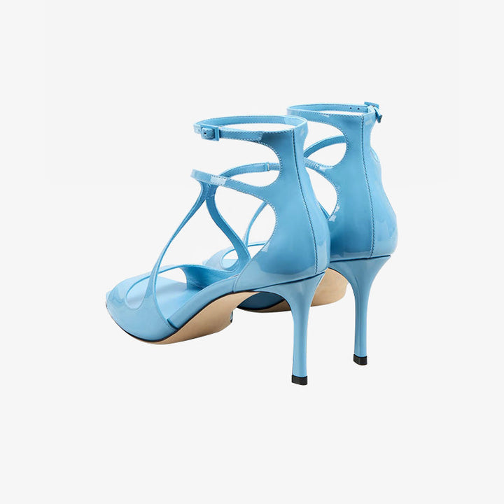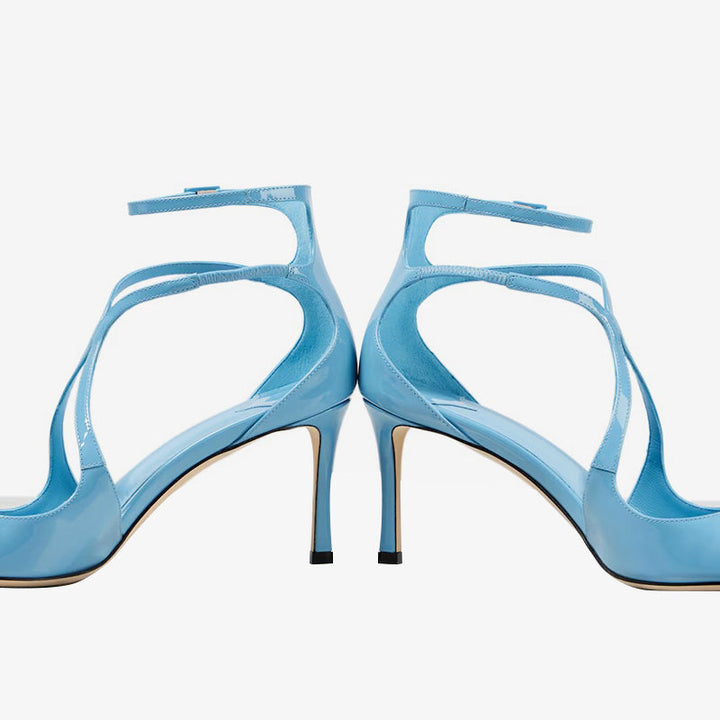Elegant 95mm blue leather pumps featuring a slim stiletto heel, a secure ankle strap, and a modern square toe design. Crafted with 100% calf leather lining, upper, and sole for premium comfort and durability.