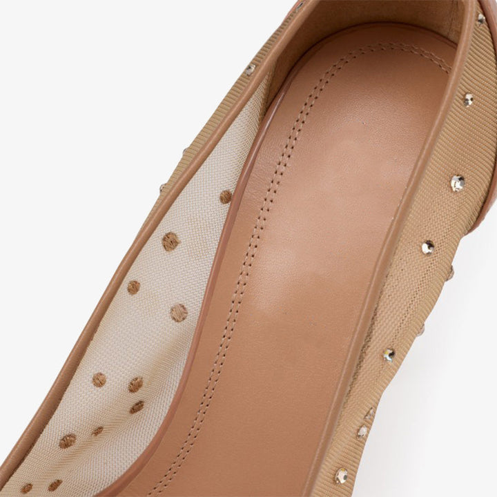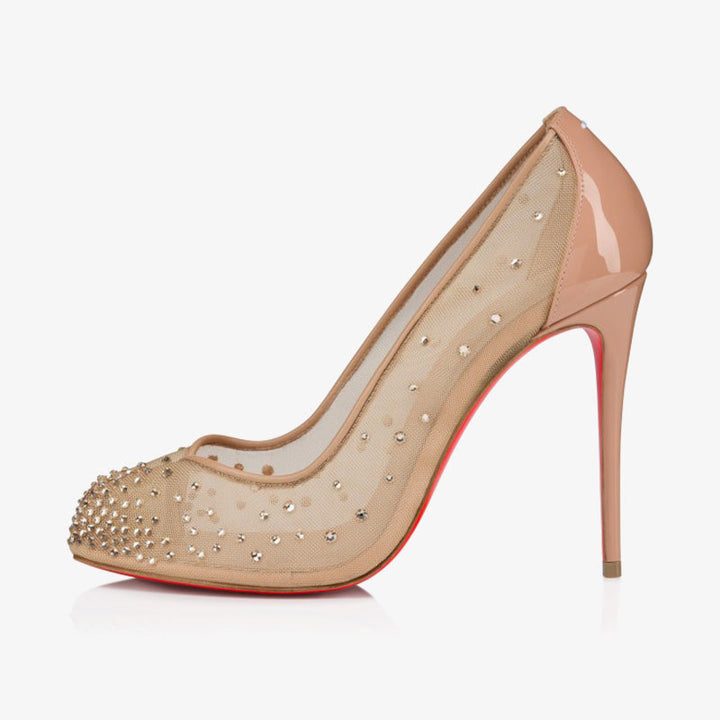 This pump features the iconic Split-toe shape, crafted from sheer Blush beige mesh in contrast with patent calf leather. Adorned with a gradation of rhinestones, it exudes elegance and sophistication. Finished on a 100mm stiletto heel, this style combines classic design with modern flair, perfect for any occasion.