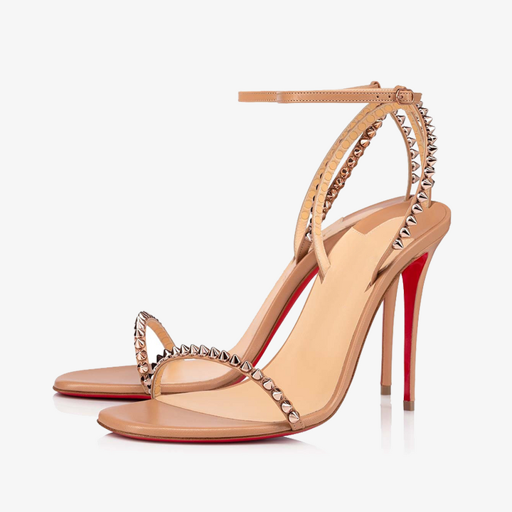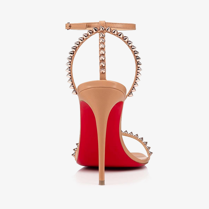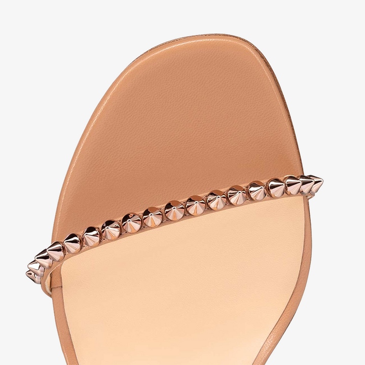 This striking open-toe sandal features a 100 mm heel that elongates the silhouette. Adorned with a single row of rose-toned emblematic spikes, the sandal exudes boldness and sophistication. The ankle strap, reminiscent of a choker necklace, adjusts with a buckle, adding a daring touch to this elegant design in beige leather.