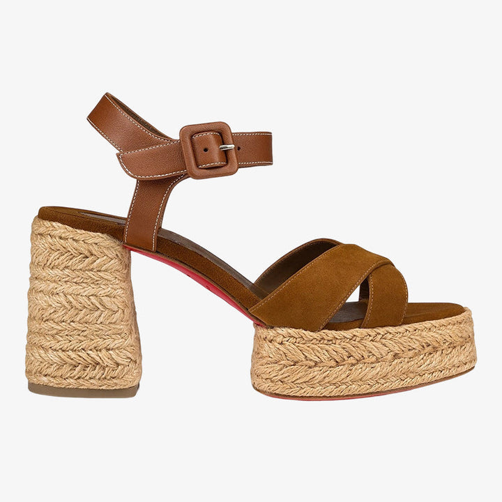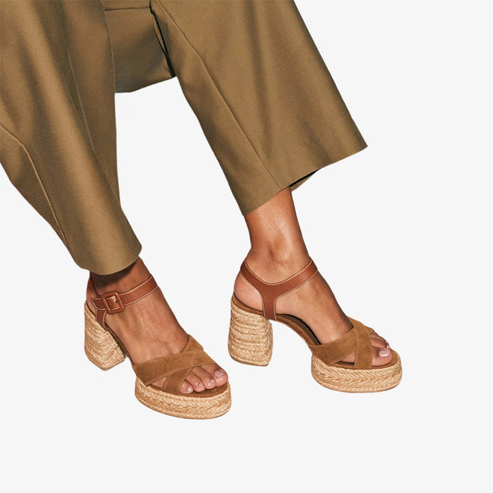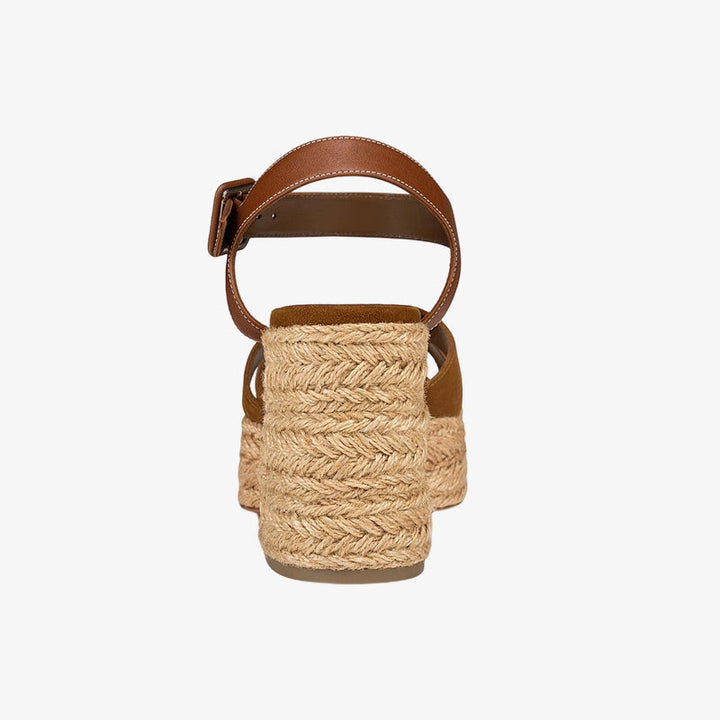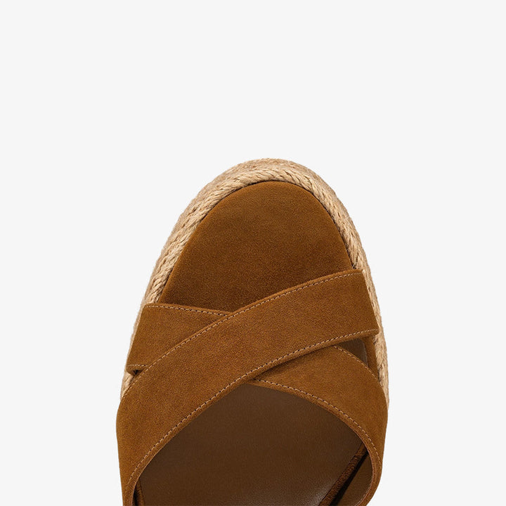 A modern update on the classic espadrille, this sandal features brown suede crossover straps, a braided sole, and an adjustable leather ankle strap with a metal clasp. Its structured silhouette and subtle heel highlight an elegant, creative style.