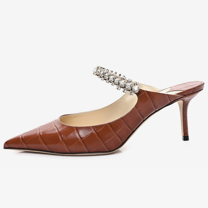 Sophisticated pumps in tan croc-embossed leather, featuring a pointed toe, crystal-embellished strap, and a 65mm heel for a polished, elegant look.
