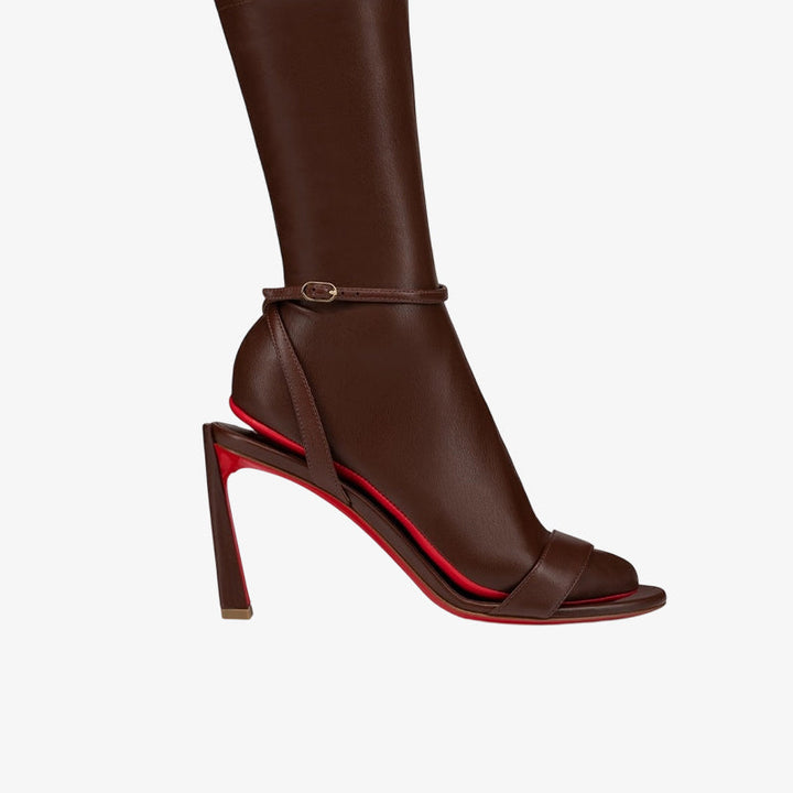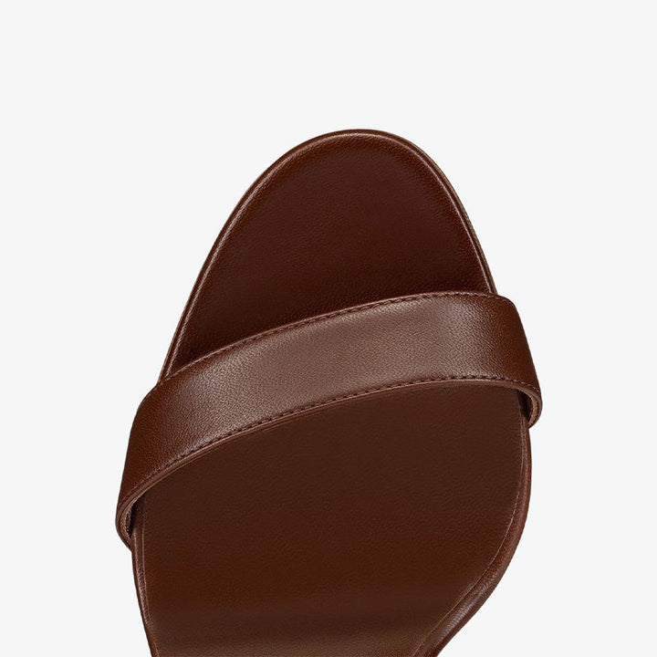 These sandals have a sleek silhouette with a flared heel and slim straps that create a modern optical illusion. A versatile piece for any wardrobe, they look chic worn alone or styled with colorful socks. Crafted from rich brown-red cowhide.