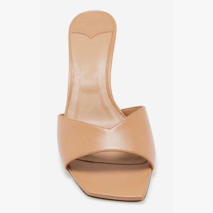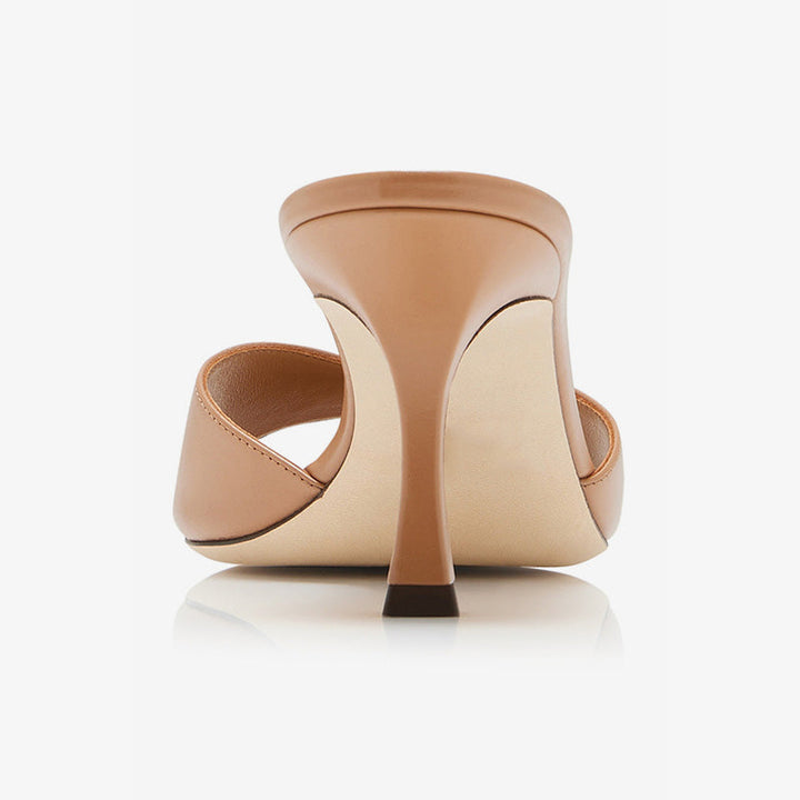 These brown calf leather mules feature a square toe, slip-on design, and a sleek 70 mm tapered heel, offering understated elegance that pairs effortlessly with any look.