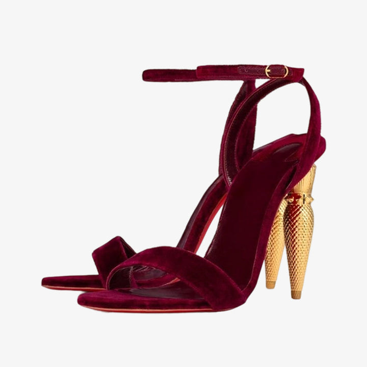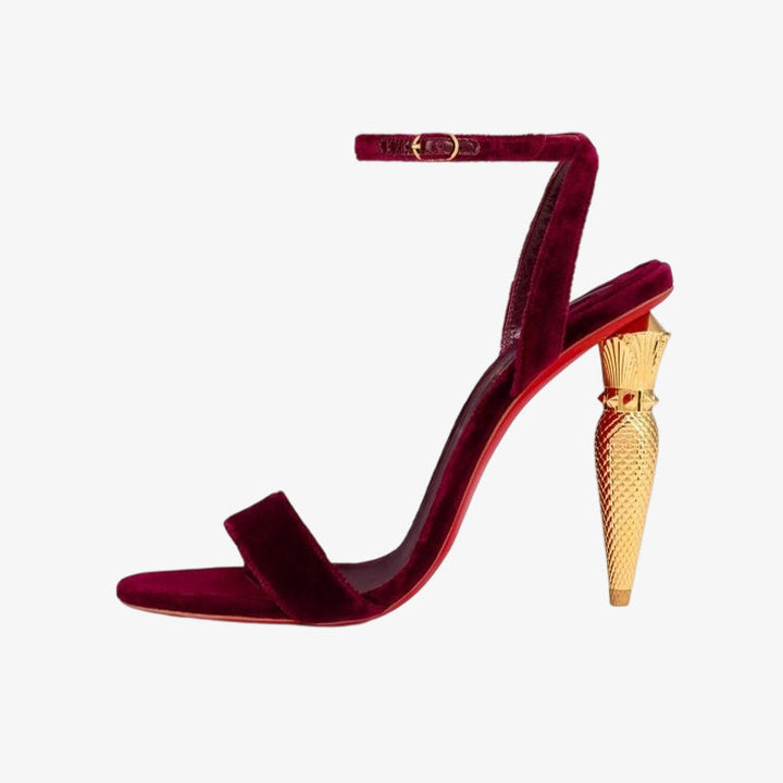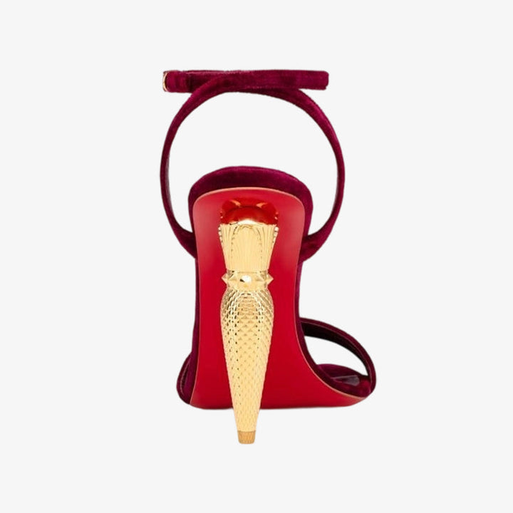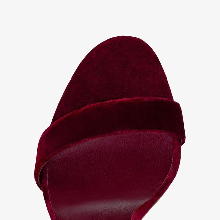Elegant and timeless, these sandals are made from soft burgundy velvet with fine topstitching, a slim toe strap, and a delicate ankle strap that wraps the foot. Finished with a rich gold heel for a touch of luxury.