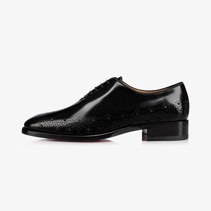 This elegant and original black oxford shoe is crafted from a single piece of abrasivato calf leather, stitched seamlessly at the back. Featuring a discreet lace-up front and grosgrain trim, it boasts a slender urban silhouette. The design is enhanced with graphic perforations and a distinctive CL monogram on the heel, showcasing meticulous craftsmanship and refined finishes.Upper: 100% patent calf leather