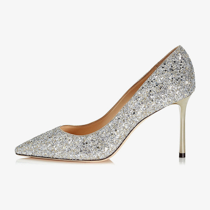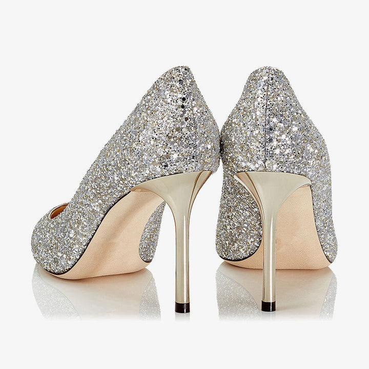 These timeless heels are updated for the season with a champagne coarse glitter fabric, exuding elegance and glamour. Leather-lined with a leather sole, the 100mm heel elongates the legs, making them the perfect complement to your evening ensemble for any special occasion.