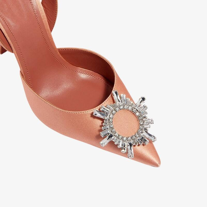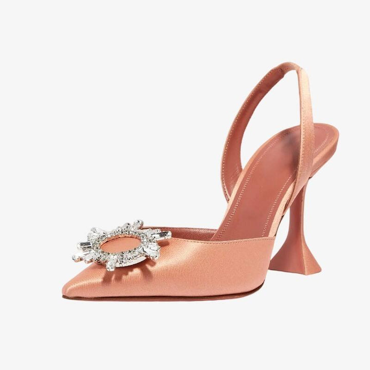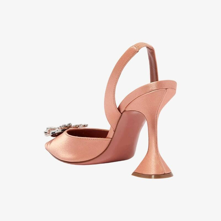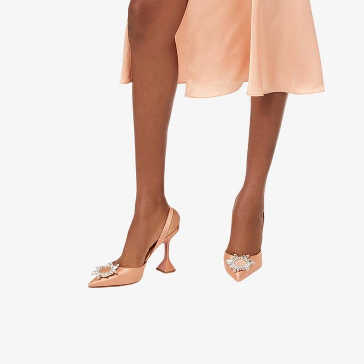 These champagne pink satin slingbacks, embellished with a delicate crystal brooch and a captivating pointed toe, exude timeless elegance. The 95mm heel provides a subtle height, and the elastic slingback strap ensures a secure and comfortable fit.