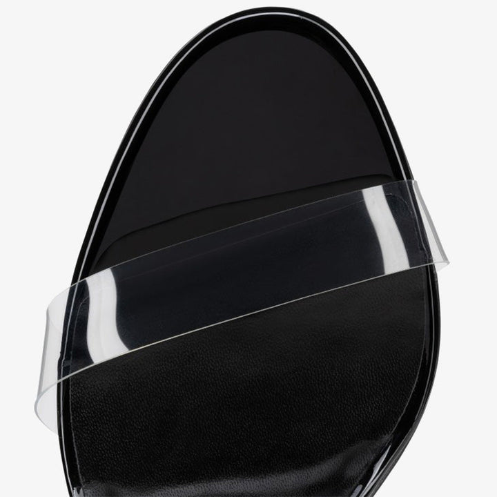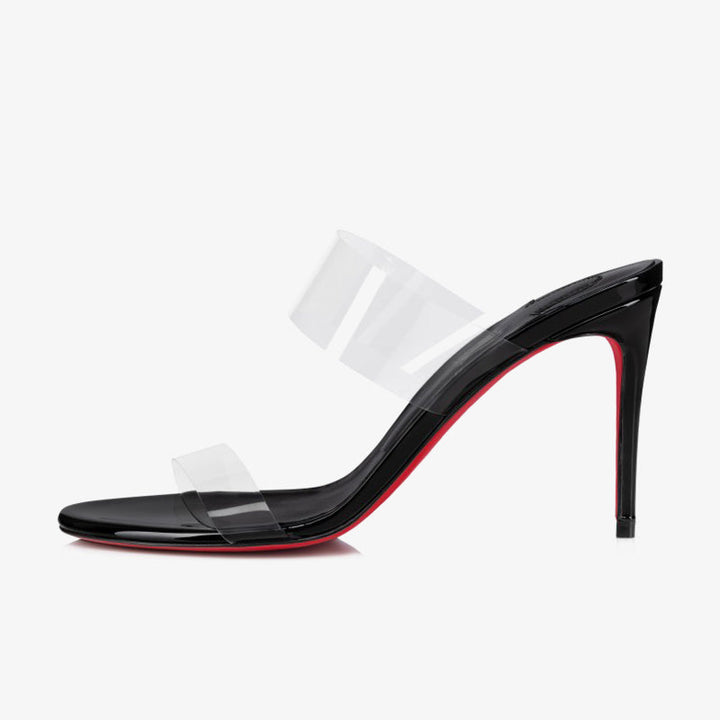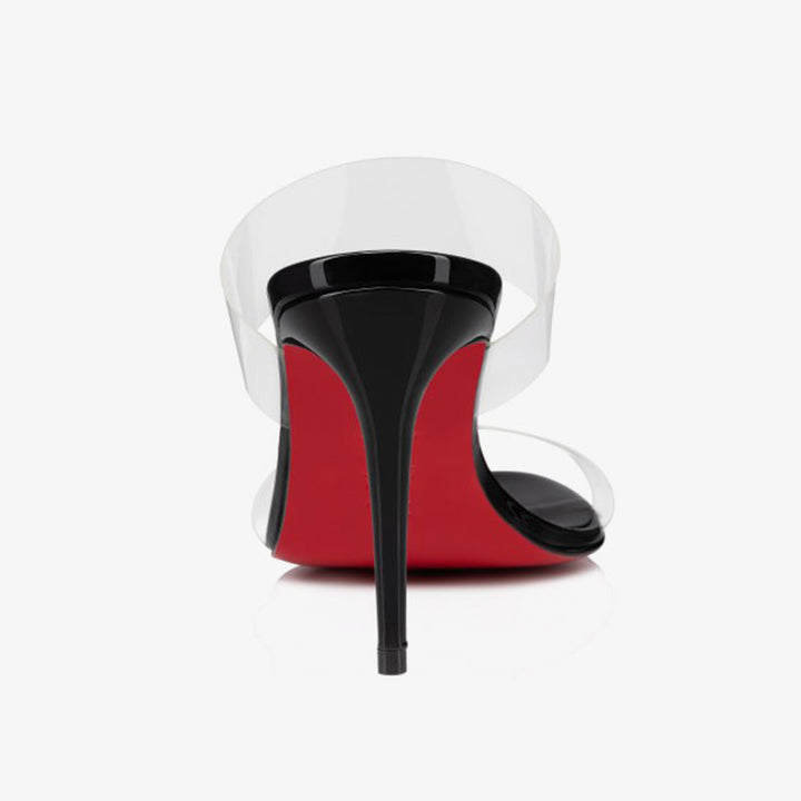 A barely-there elegant mule in black, exquisitely finished in calf leather. Two transparent straps, crafted from a durable and supple PVC, securely hold the shoes in place while a slender stiletto heel adds sophistication. The deep black hue adds timeless allure, and the heel height—approximately 80 mm—offers a graceful lift. Ideal for summer parties and warm nights.