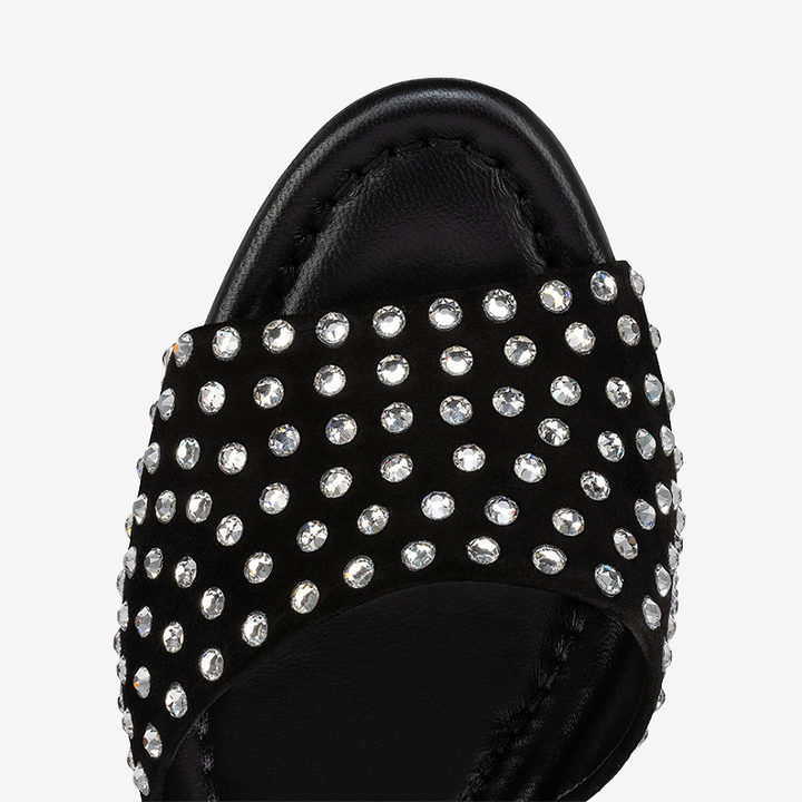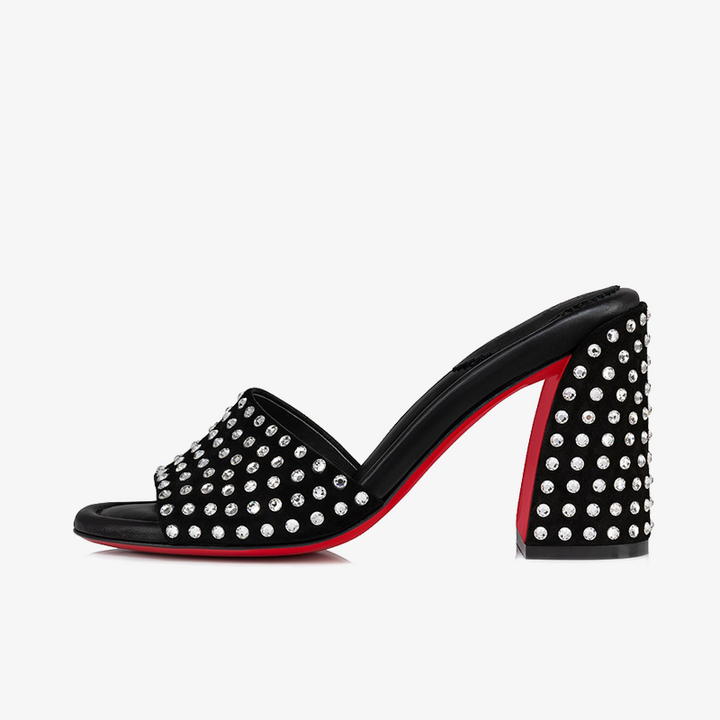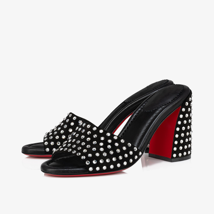This elegant sandal features a square, angled 100 mm heel, offering both style and comfort. Crafted from luxurious black velvet, it is adorned with hand-placed strass for a subtle touch of sparkle. The clean, slender strap elegantly dresses the foot, with discreet finishing touches that elevate this timeless design.
