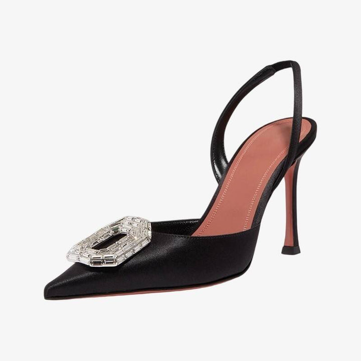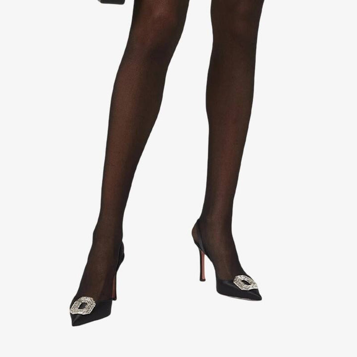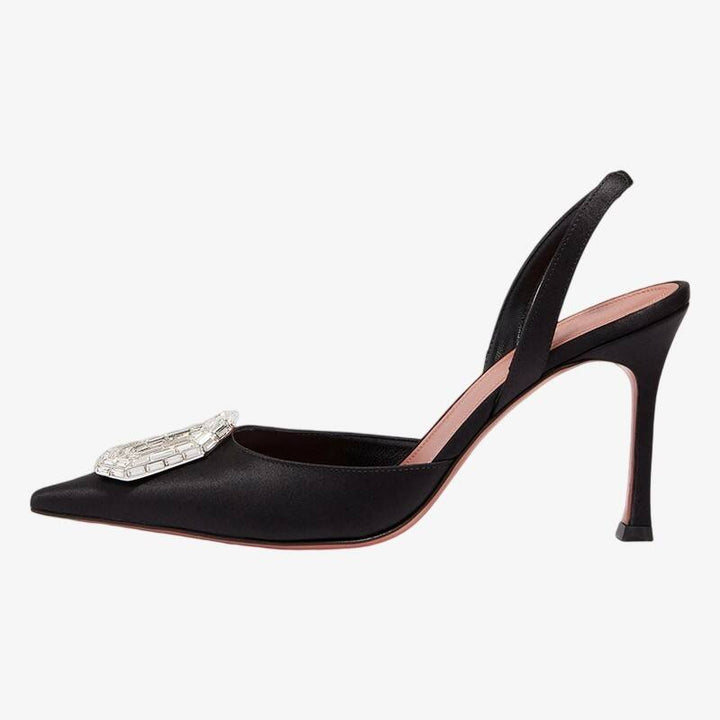 Make a bold statement in these elegant black satin slingbacks, featuring a dazzling crystal buckle and sleek pointed toe. The 85mm heel adds sophisticated height, while the slingback strap ensures a secure, comfortable fit. Crafted with premium leather for lasting quality.Color: black