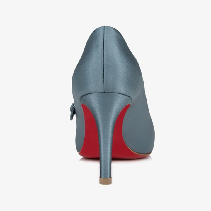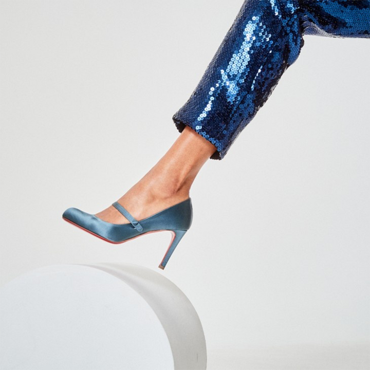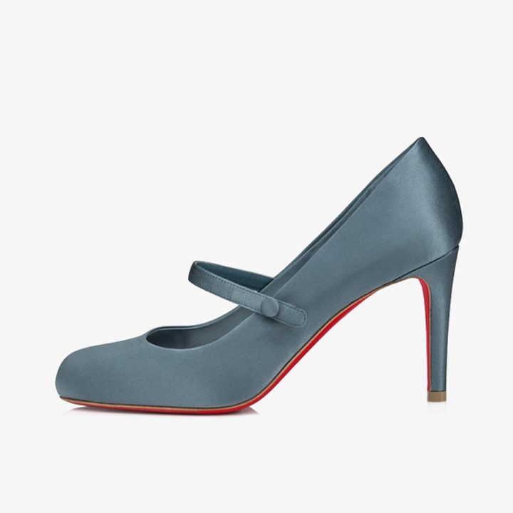 A timeless classic, this pump features a rounded toe and a daring low-cut vamp, enhanced by a slim strap that fastens with a press-stud. Crafted in luxurious navy crepe satin, it reveals the foot with an elegant touch. Set on an 80 mm stiletto heel, this model exudes urban sophistication and sleek style.