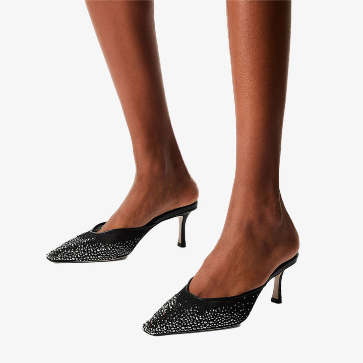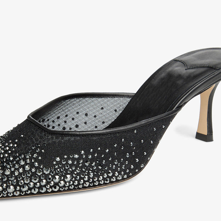 A bold fusion of modern design and refined elegance, these mules feature a sheer mesh upper adorned with a gradient of shimmering crystals. The sleek pointed toe and structured square-cut vamp create a striking silhouette, while the supple leather lining ensures comfort with every step. Perfect for adding a touch of glamour to any ensemble.The heel height of this pair is 60mm.