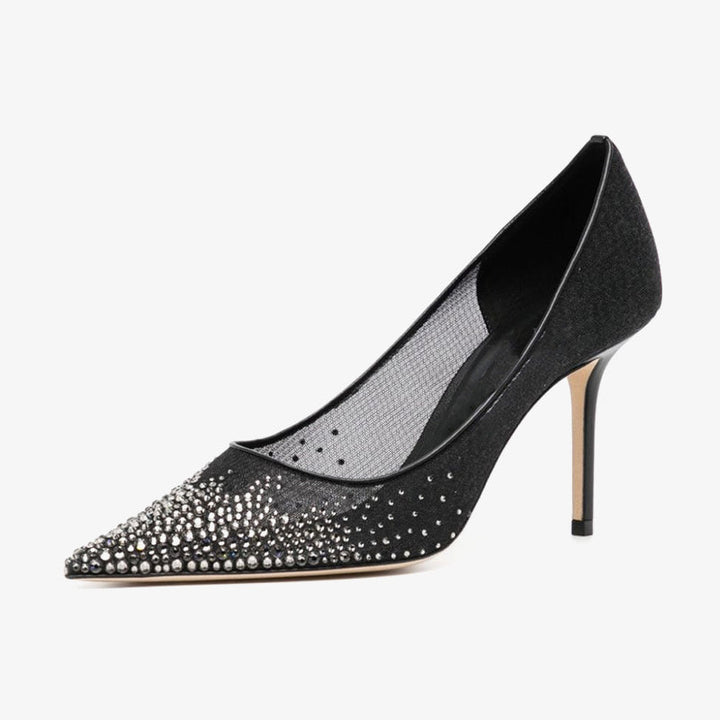 Delicately crafted with sheer mesh and adorned with sparkling crystals, these pumps exude refined glamour. The pointed-toe silhouette and sleek leather construction create an effortlessly elegant look, perfect for elevating any ensemble with sophistication.The heel height of this pair is 80mm.