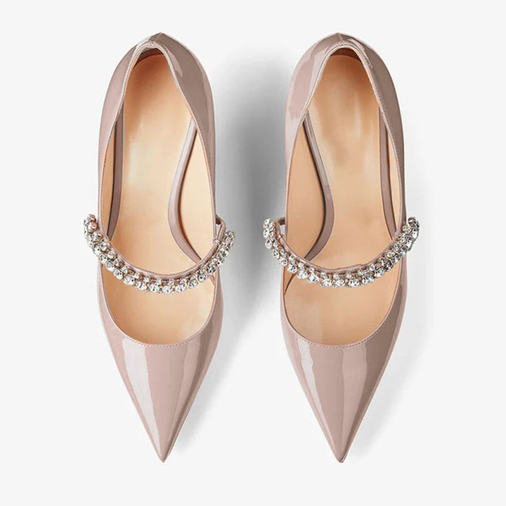 Elevate your collection with these exquisite ballet pink patent leather pumps, featuring a pointed toe and a hand-finished crystal-adorned strap. The intricate crystals add a touch of glamour, transforming a timeless classic into a statement piece. With leather lining and sole, this style is both luxurious and versatile, perfect for any occasion.The heel height of this pair is 65mm.