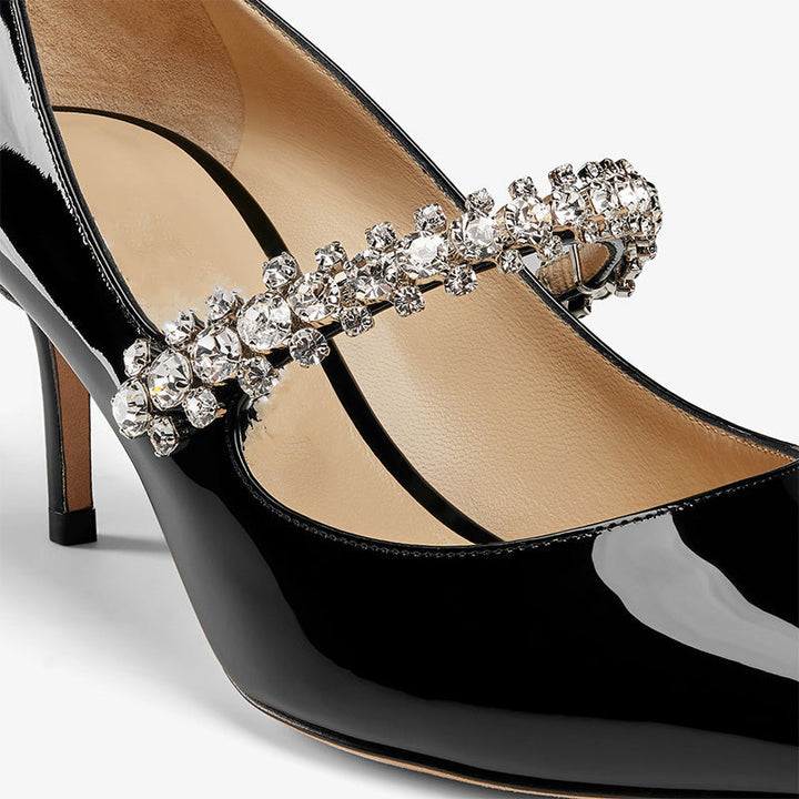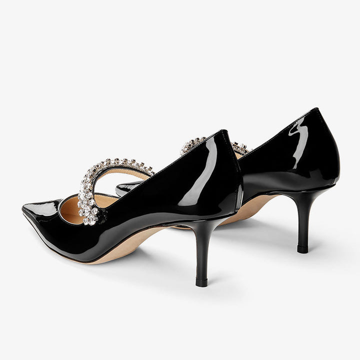 A timeless pointed-toe pump reimagined with dazzling sophistication. Crafted from glossy patent leather, this elegant style is adorned with a hand-finished crystal strap, adding a refined touch of glamour. Versatile yet statement-making, it’s designed to captivate on any occasion.