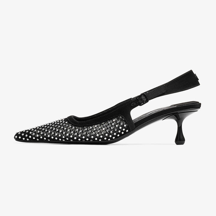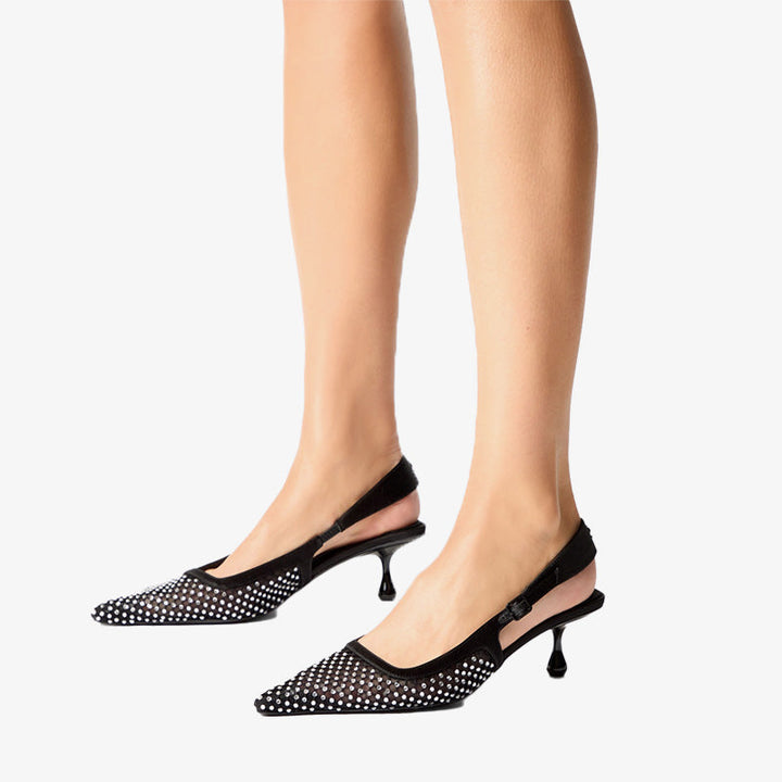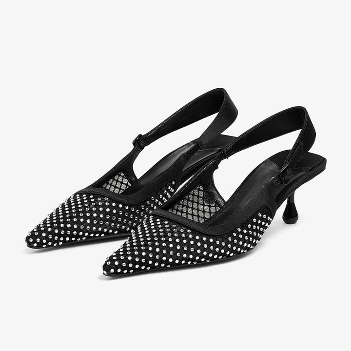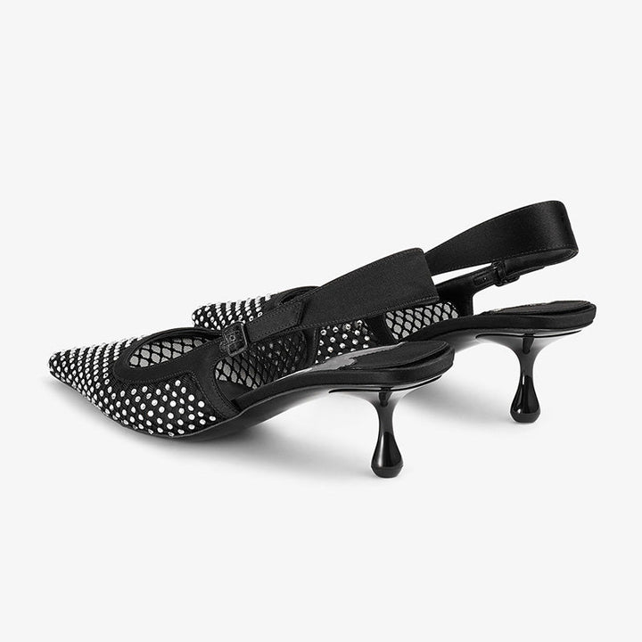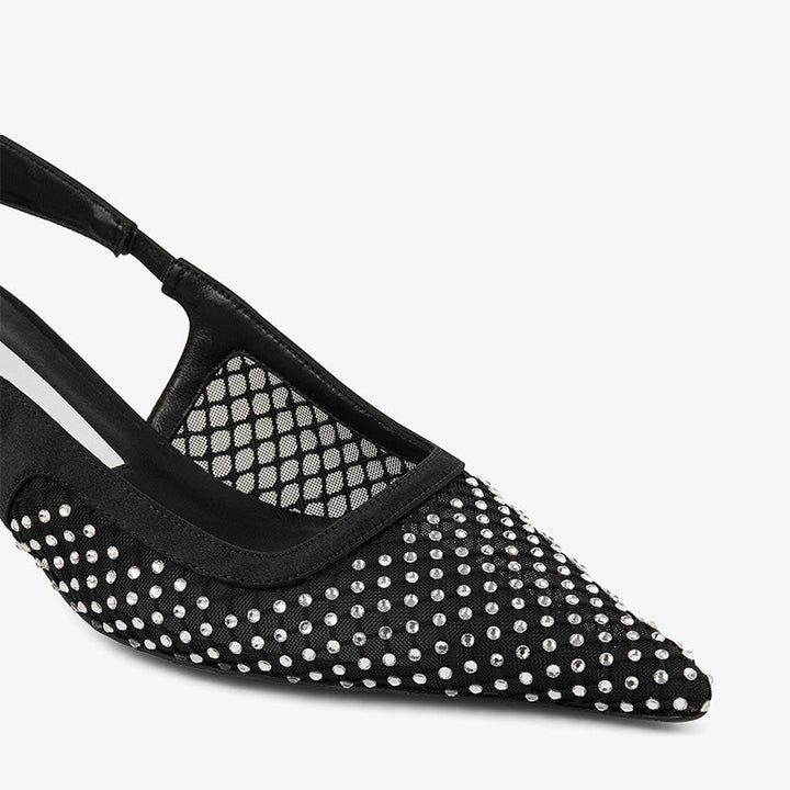 Elevate your style with these satin slingback pumps, featuring a crystal-embellished mesh upper and a sleek pointed toe. The elegant drop heel adds a modern touch, while the adjustable strap ensures a secure fit. Crafted for both comfort and sophistication, this design is a timeless addition to any wardrobe.The heel height of this pair is 60mm.