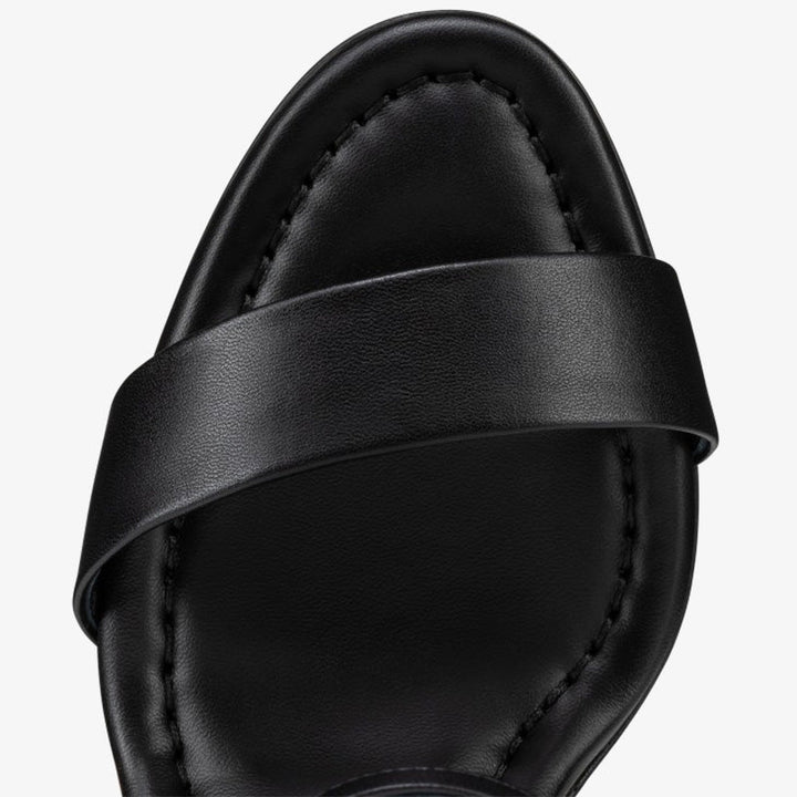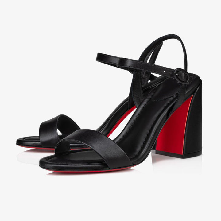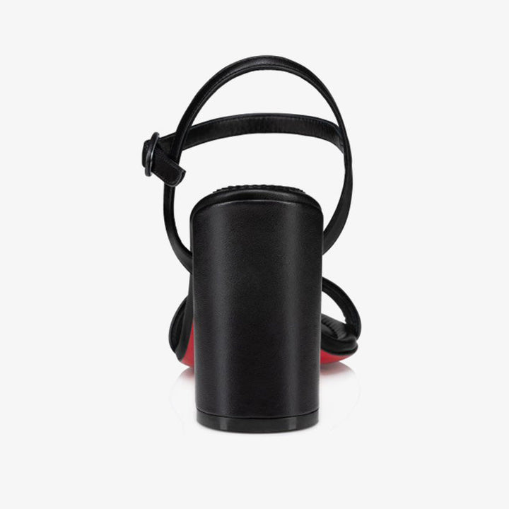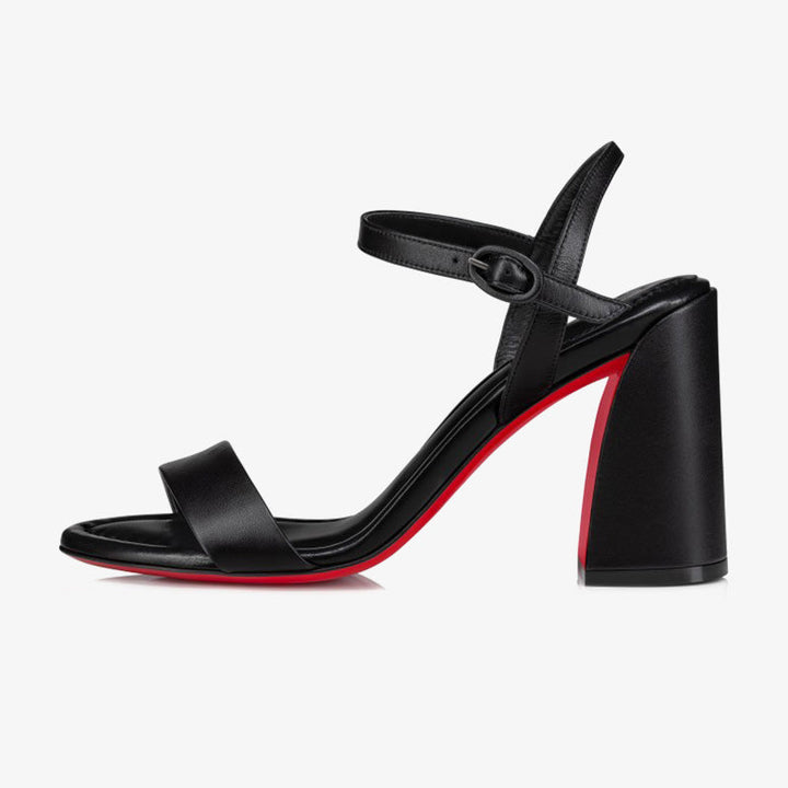 This graceful sandal features a gently tapered block heel and rounded open toe, crafted in sleek black calf leather. A single ankle strap with an oval buckle adds refined detail, while the iconic red sole offers a bold, stylish contrast. The black shade enhances its versatility, and the approximately 100 mm heel brings just the right touch of elevated poise—perfect for effortless transitions from daytime polish to evening allure.