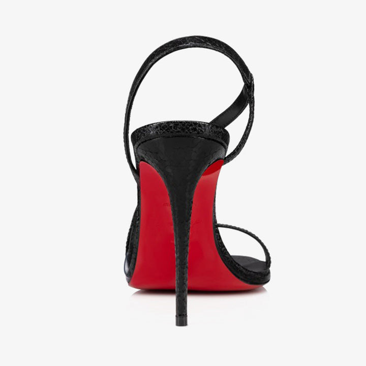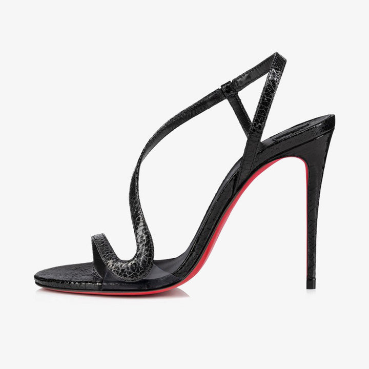 This "barely-there" sandal is crafted from sleek leather, elegantly revealing the foot for a delicate, minimalist look. Set on an 100mm stiletto heel, it offers the perfect balance of style and comfort, ideal for both day and evening wear. The design enhances its bold, sophisticated appeal, making it a timeless addition to any wardrobe.
