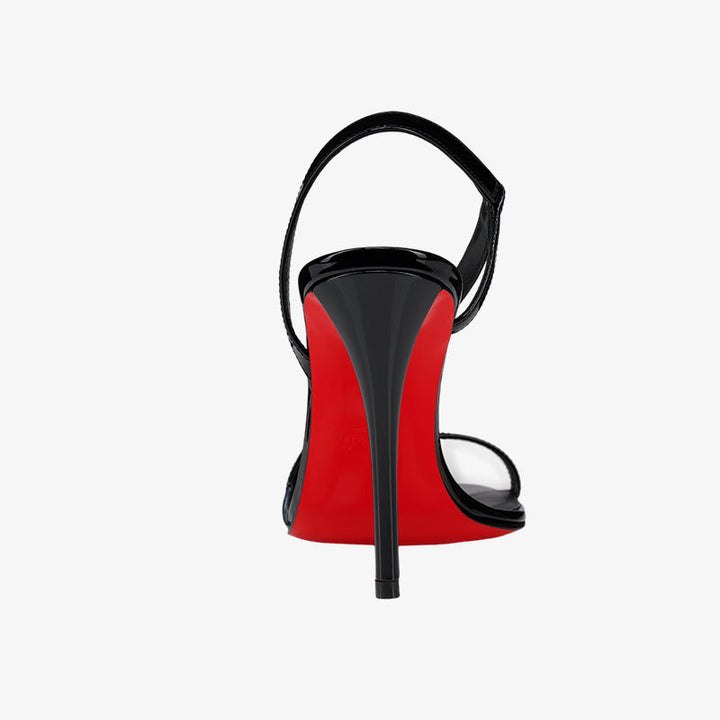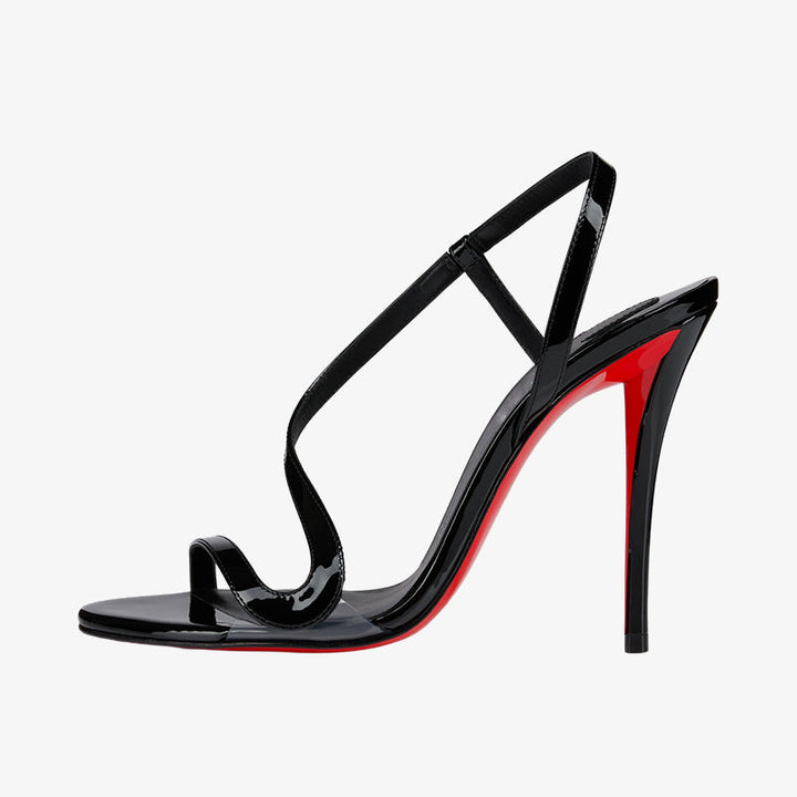 This sleek black sandal boasts graceful curved lines and delicate straps that elegantly embrace the foot. Made from shiny patent leather with a padded insole, it features a 100mm stiletto heel and a vibrant red sole treated with advanced durable coating technology.
