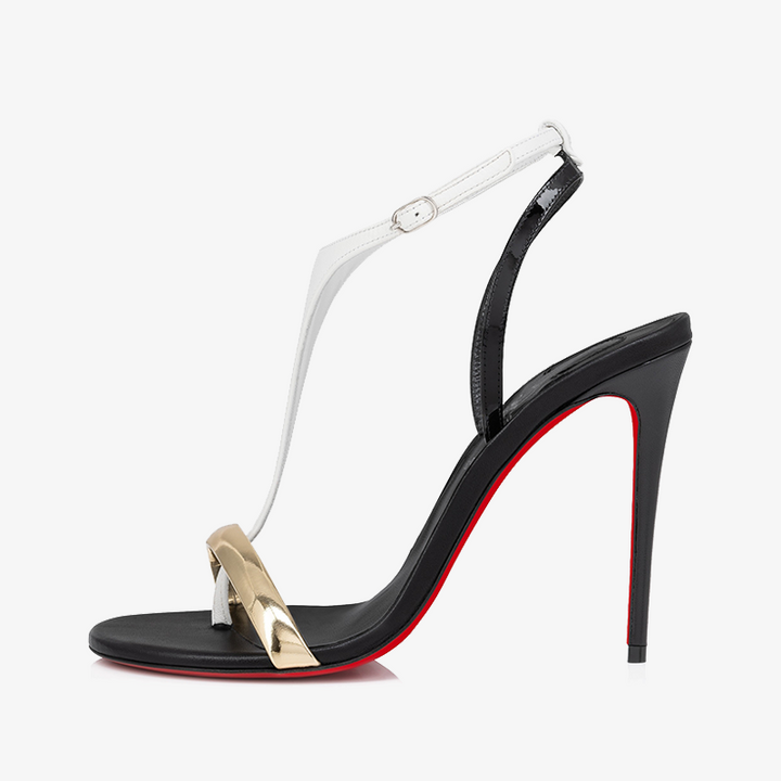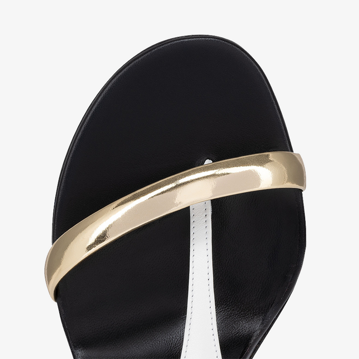 The lightweight sandal showcases craftsmanship and expertise. It features a gold leather band that elegantly dresses the foot, complemented by a slender laminated calf leather strap that wraps delicately around the ankle. Set on a 100 mm heel, this sandal offers both sophistication and comfort.