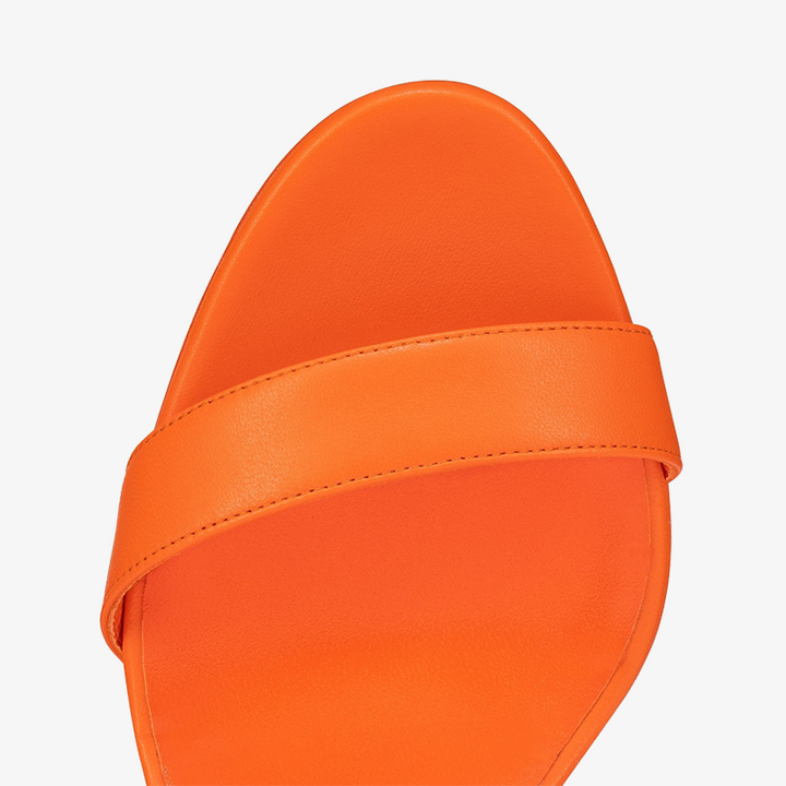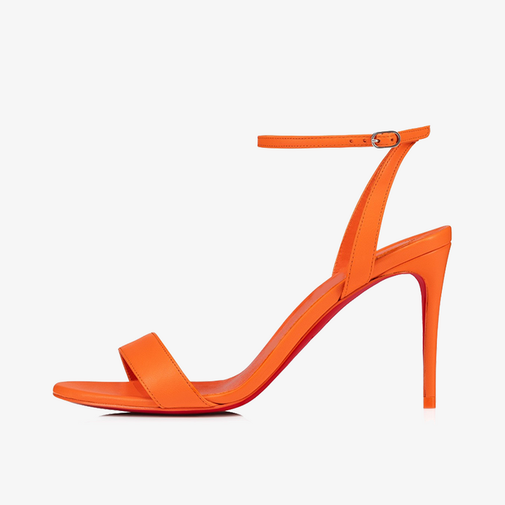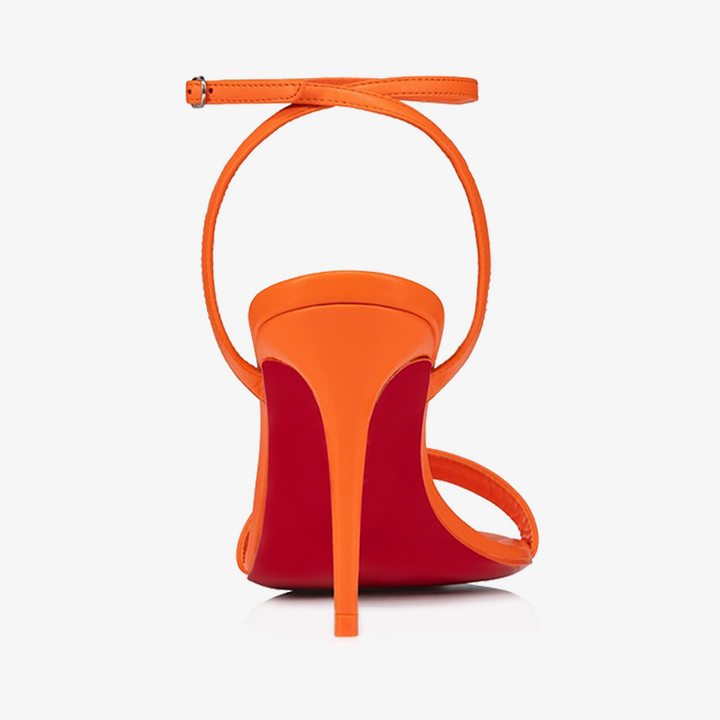 A timeless strappy sandal with an elegant appeal, this model features an 80 mm stiletto heel that creates a beautiful arch. A single slender strap crosses the toe, while a metallic buckle fastens the ankle. Crafted in bright orange calf leather, it adds a hint of sunshine to any look.