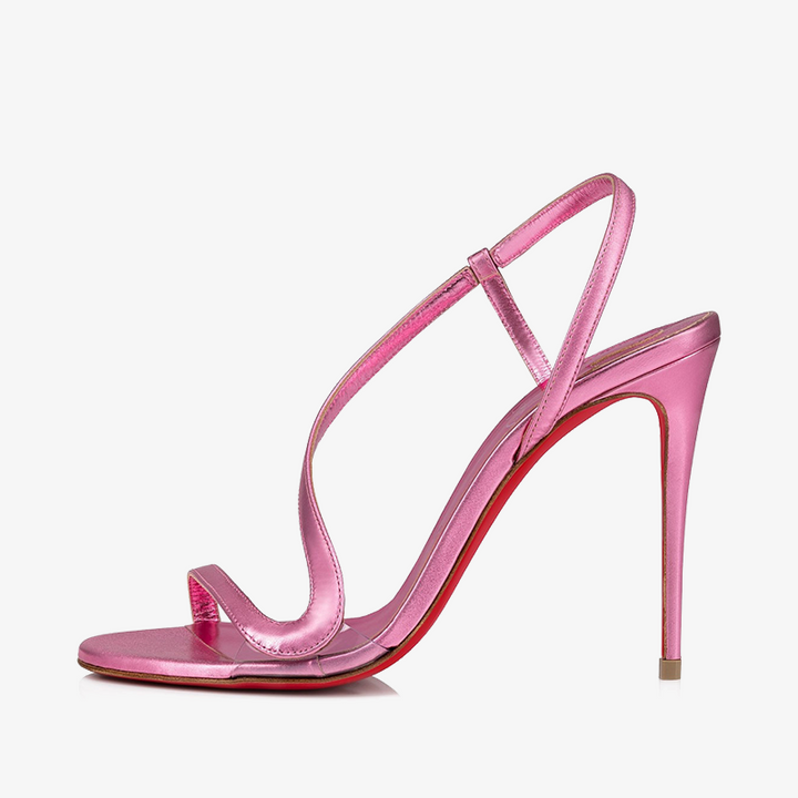 A decorative sandal with a wavy strap that works its way over the toe, across the foot, and up to the ankle, this design showcases creativity and savoir-faire. Set atop a 100 mm stiletto heel, it creates a beautiful arch in the foot. Crafted in Glam pink laminated leather, it delivers a shimmering finish with a touch of modern elegance.