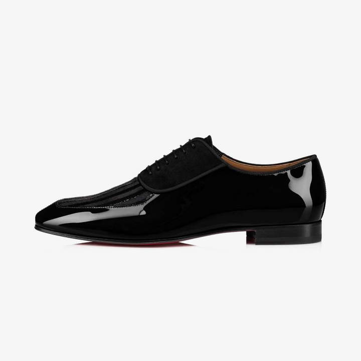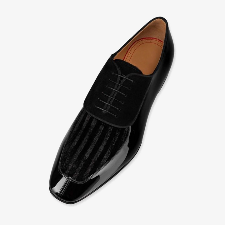 Showcasing expert craftsmanship, this black Oxford shoe combines a harmonious blend of patent calf leather, suede calf leather, and striped velvet. The tone-on-tone grosgrain trim and slim sole complete the refined, elegant look.Upper: 100% patent calf leather,velvet and suede