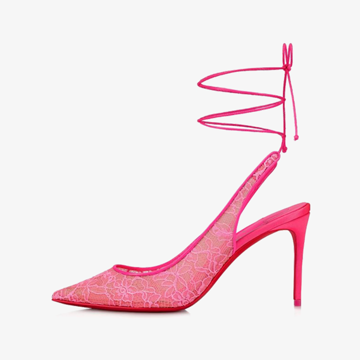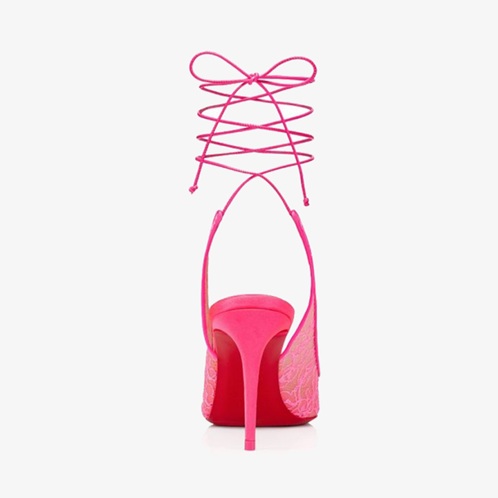 This chic pump features a slender 80 mm wrapped stiletto heel and a subtly pointed toe. Crafted with a fluo pink lace upper, it is finished with a tonal ankle tie detail for added elegance. Intricate invisible stitching and the signature red sole complete this must-have model for timeless, stylish looks.