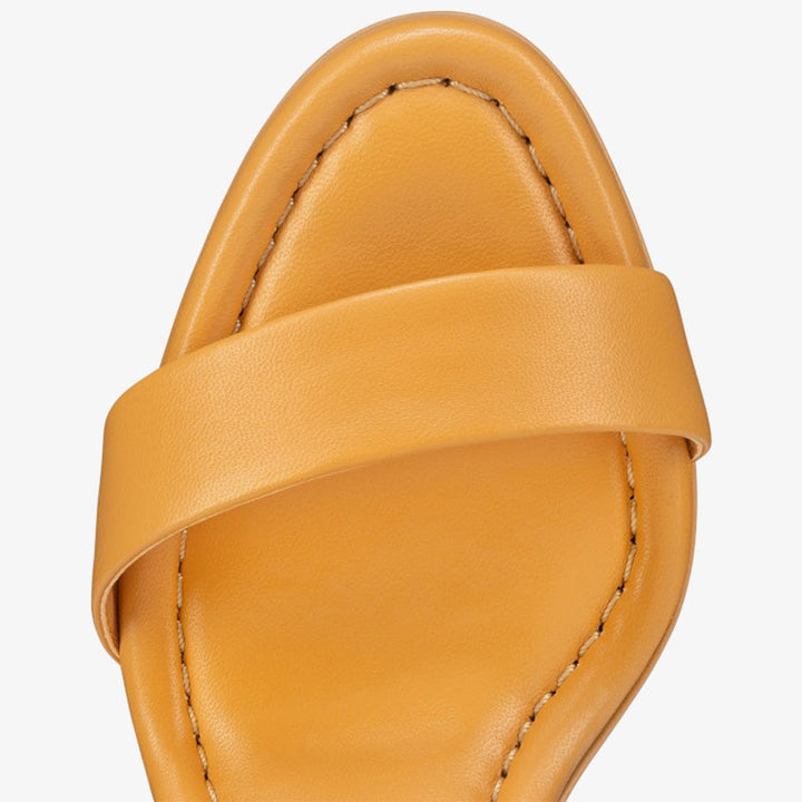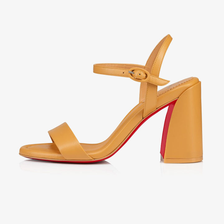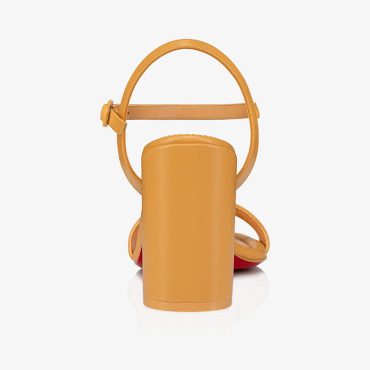 These elegant sandals are distinguished by the beveled shape of their 100mm block heel. Crafted entirely from Giraffe orange leather, the design is both delicate and stylish, featuring a sleek, thin strap that elegantly adorns the top of the foot. The ankle is accentuated with a strap that fastens with a small metal clasp, while a padded insole ensures comfort with every step.